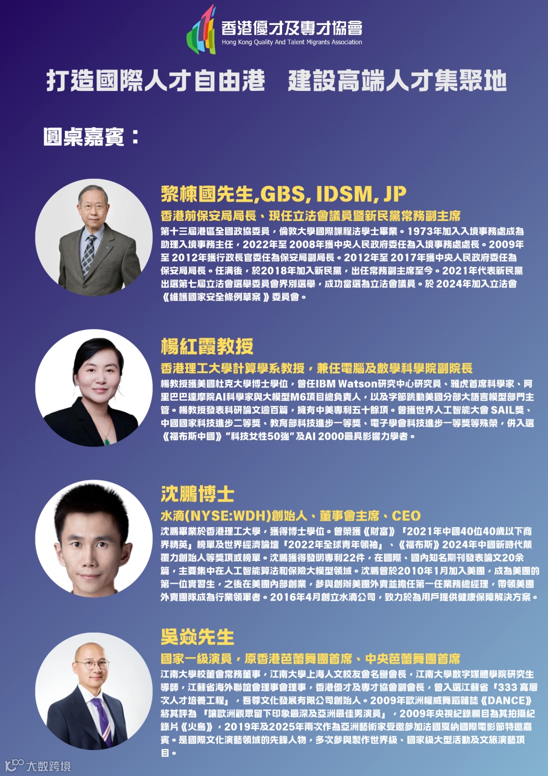 在全球人才競爭格局深刻變革的今天,香港如何匯聚四方菁英,鞏固其國際人才樞紐的核心地位?本屆核心活動圓桌論壇,將圍繞“打造國際人才自由港,建設高端人才集聚地”這一戰略議題展開深度探討。