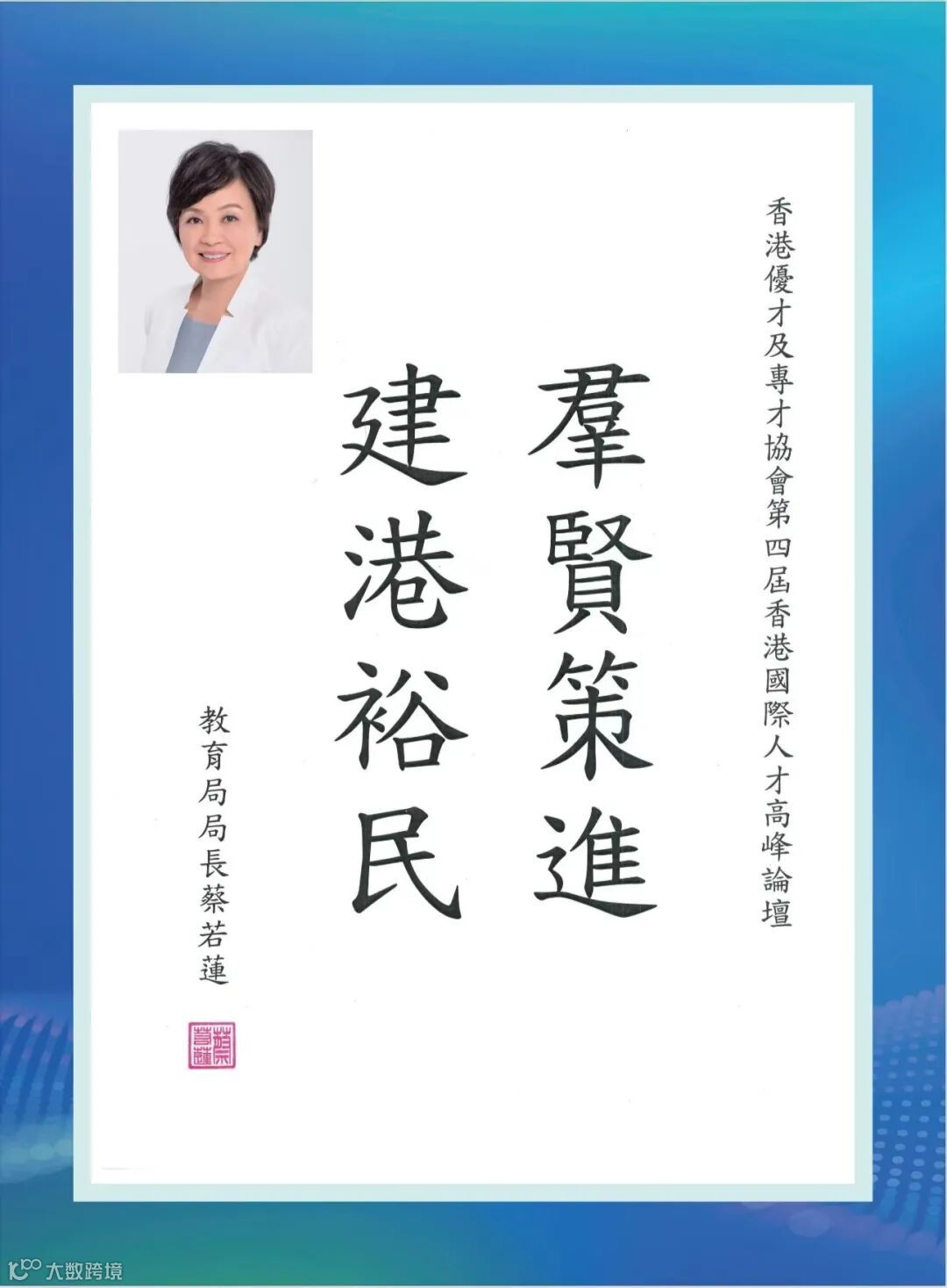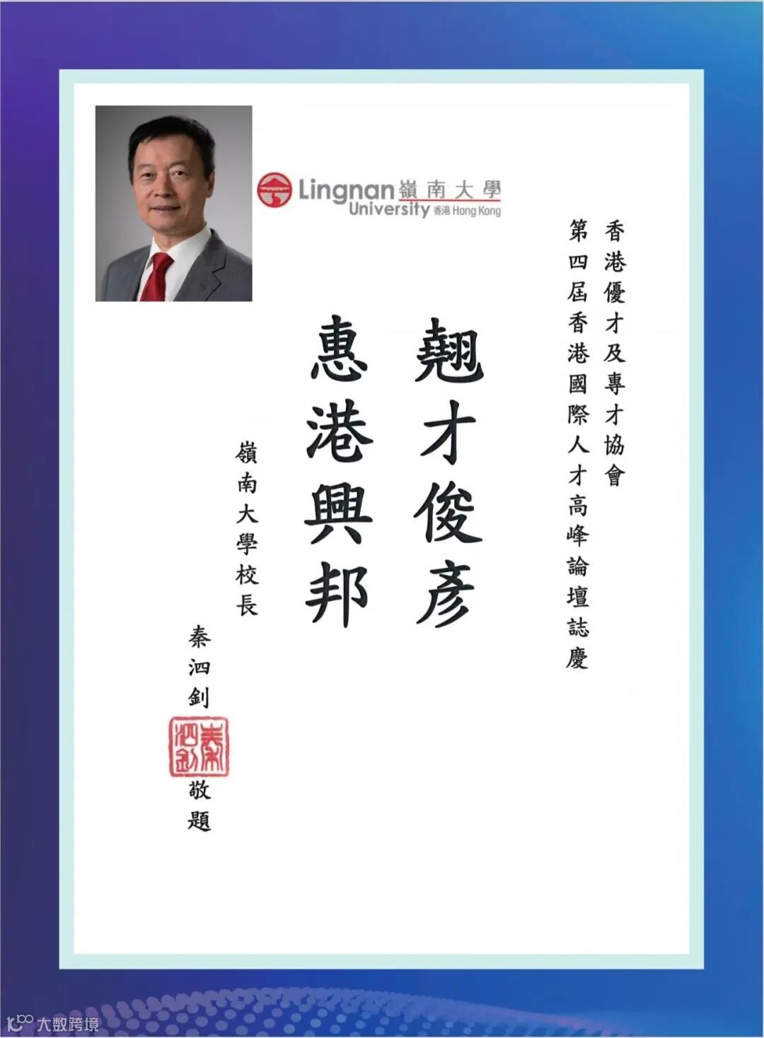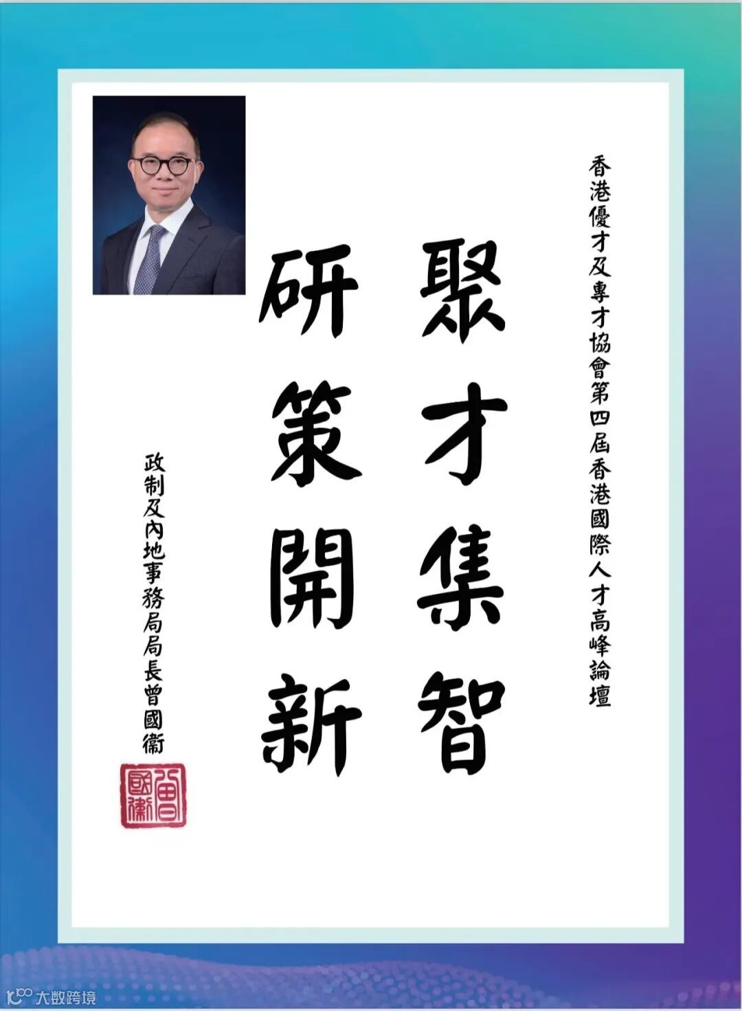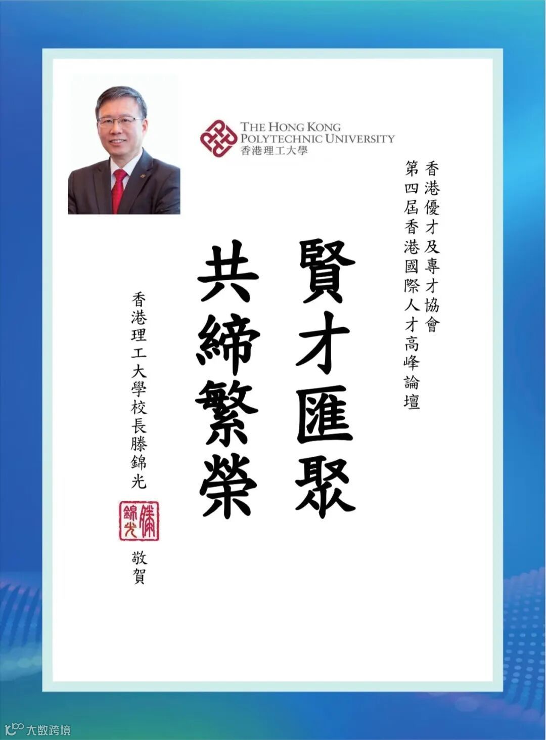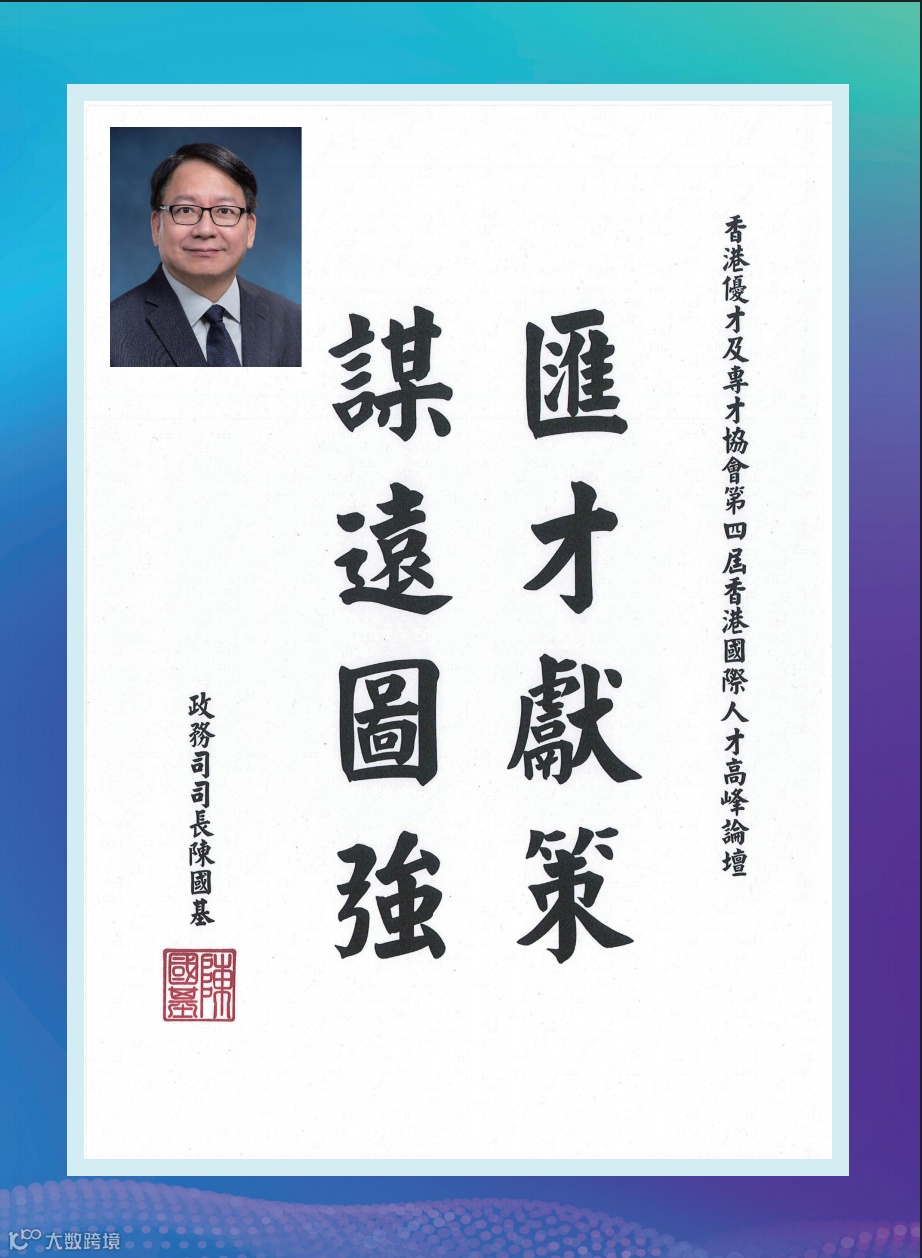 香港特區政府李家超行政長官因赴京述職未能親臨現場,特為論壇親筆題詞「凝才匯智,建港昌邦」。政務司長、財政司長、立法會主席、行政會議召集人、20余位局長及部門首長、澳門特區政府人才發展委員會、全國人大及政協常委、香港各大學校長等都揮毫題詞,為峰會活動錦上添花!