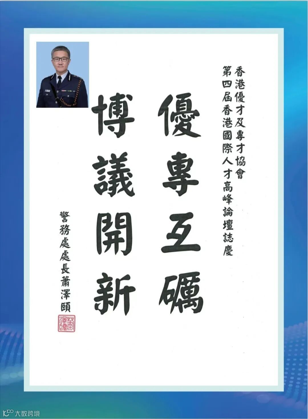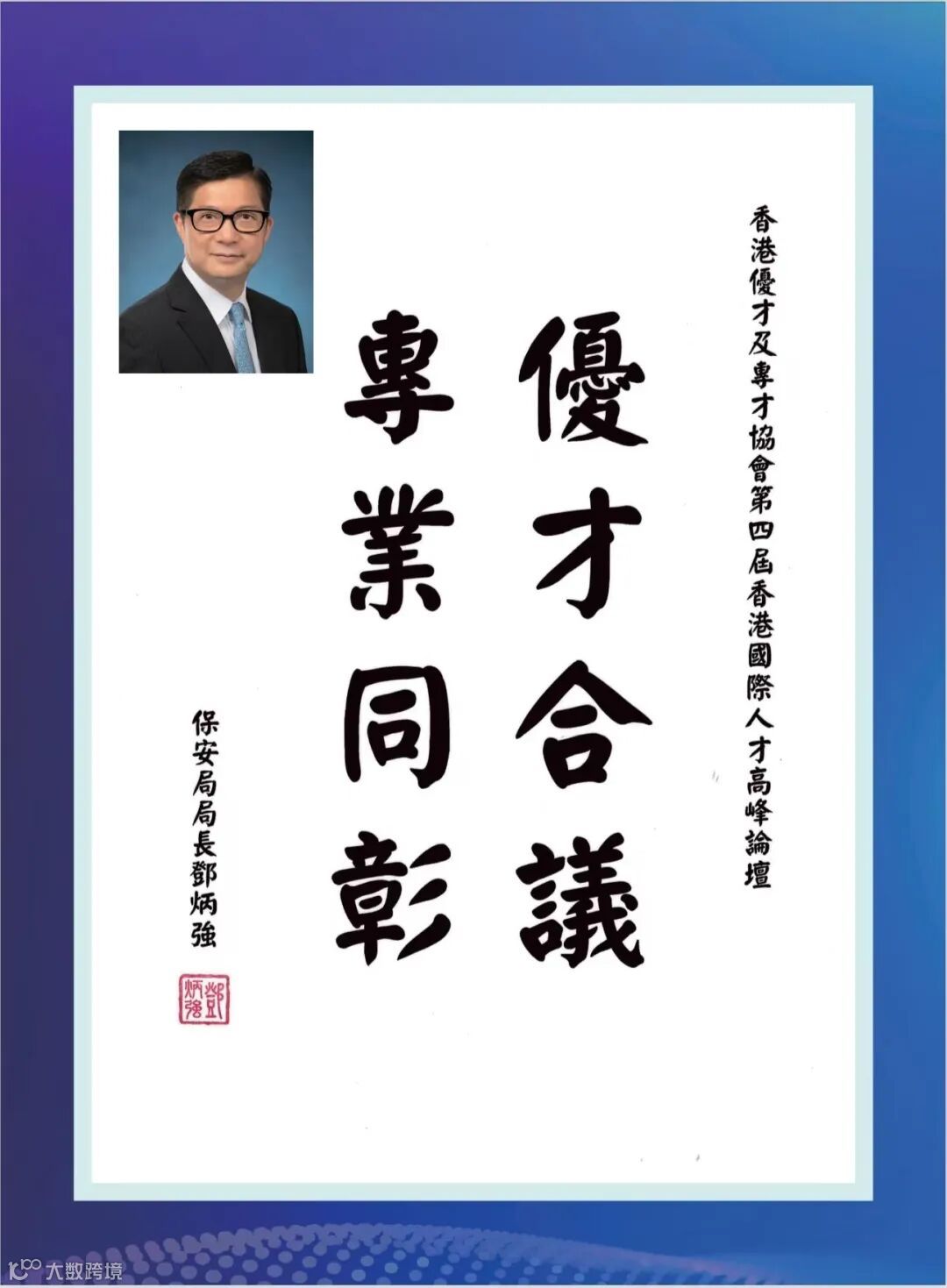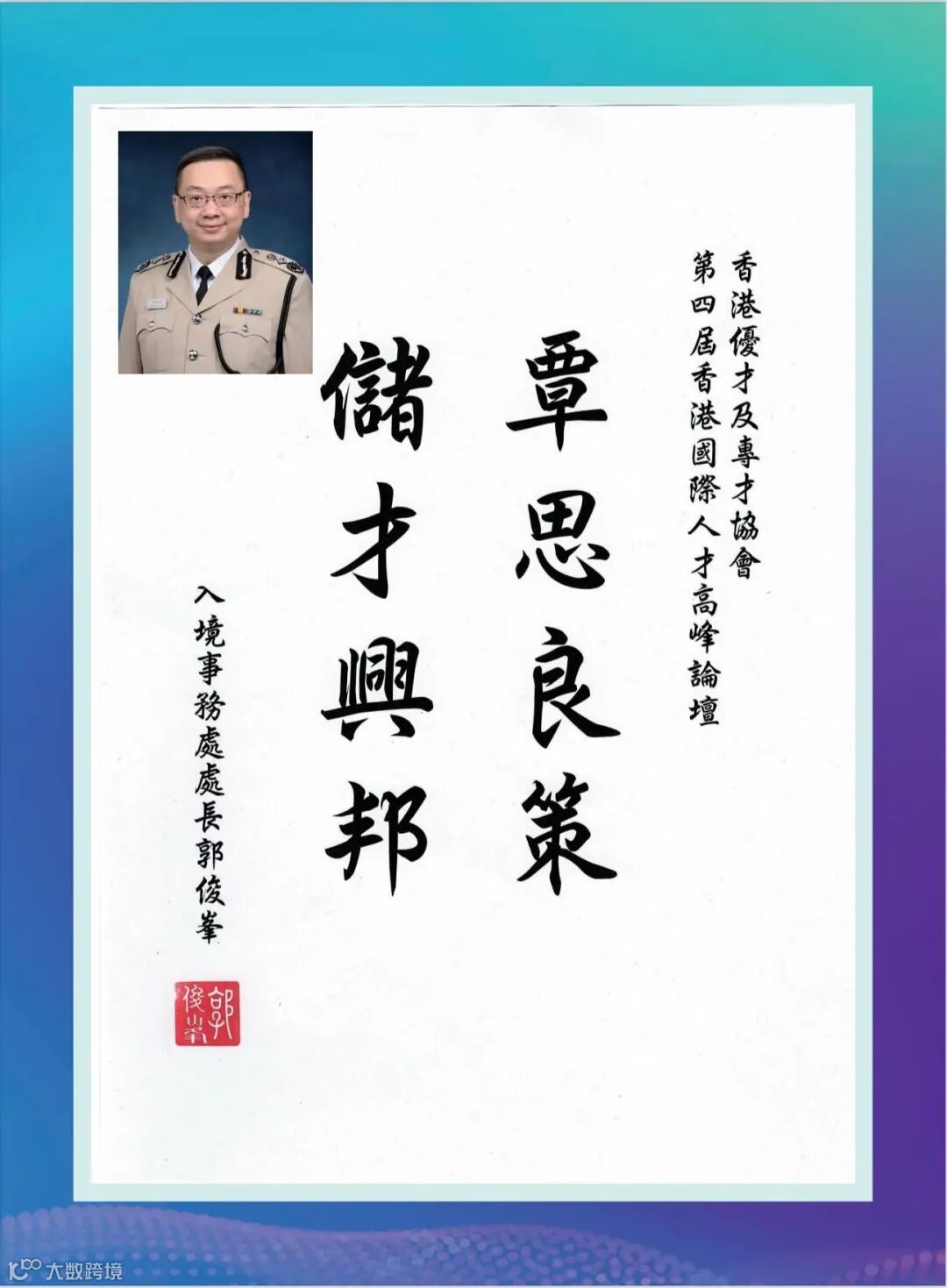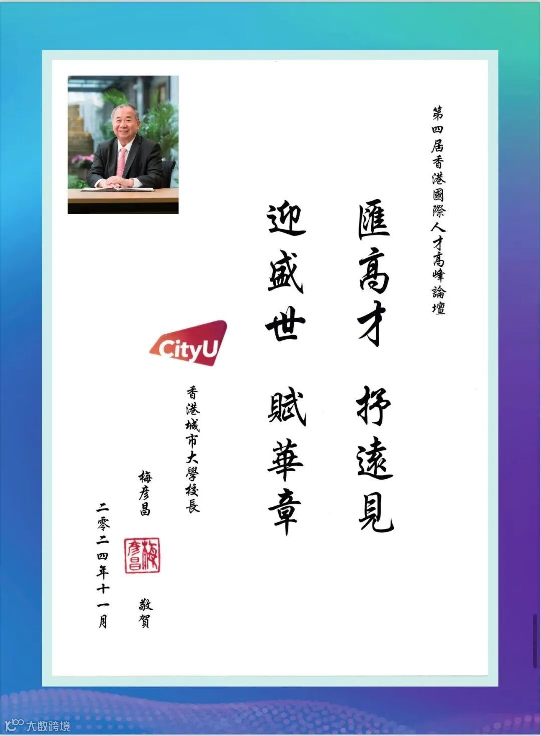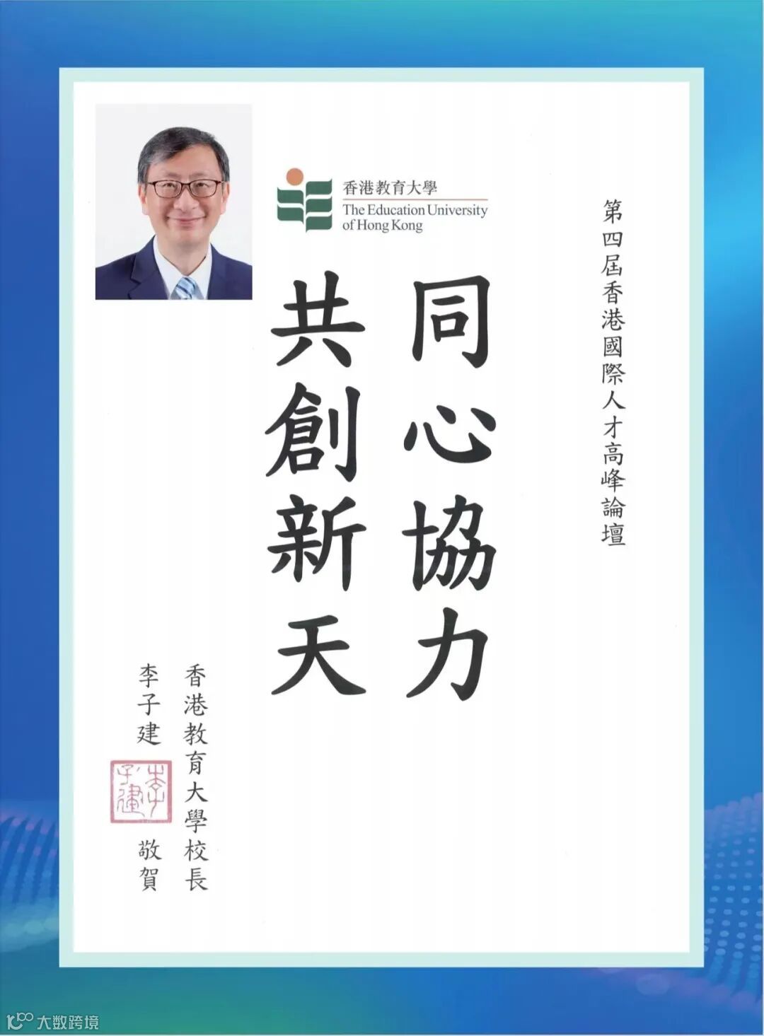 香港特區政府李家超行政長官因赴京述職未能親臨現場,特為論壇親筆題詞「凝才匯智,建港昌邦」。政務司長、財政司長、立法會主席、行政會議召集人、20余位局長及部門首長、澳門特區政府人才發展委員會、全國人大及政協常委、香港各大學校長等都揮毫題詞,為峰會活動錦上添花!