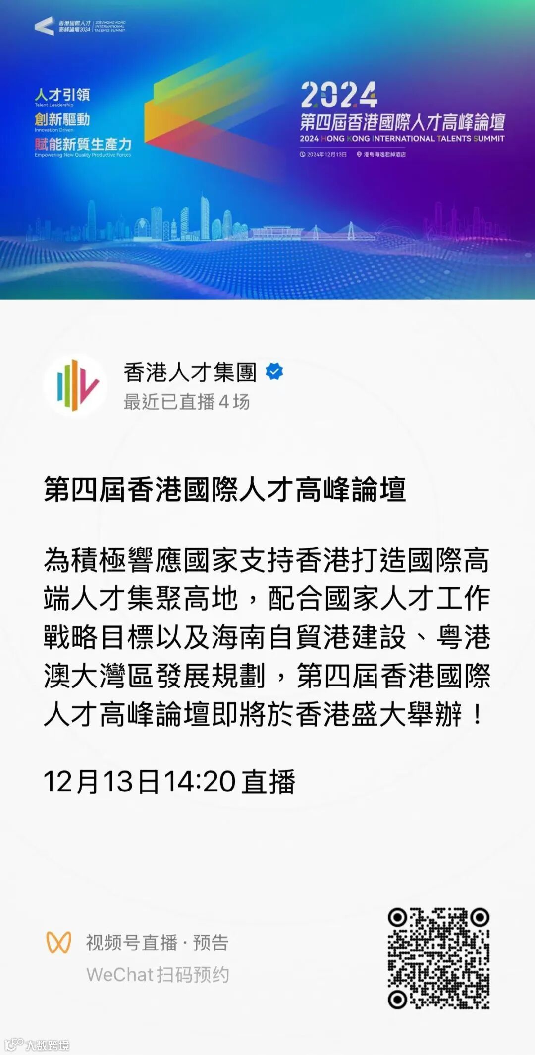 為積極落實二十屆三中全會提出的「支持香港打造國際高端人才集聚高地,健全香港在國家對外開放中更好發揮作用機制」的精神,配合國家人才工作戰略目標以及海南自貿港建設、粵港澳大灣區發展規劃,全力支持特區政府施政,由香港國際人才高峰論壇組委會主辦的「第四屆香港國際人才高峰論壇」於12月13日在香港香港海逸君綽酒店隆重舉辦。
