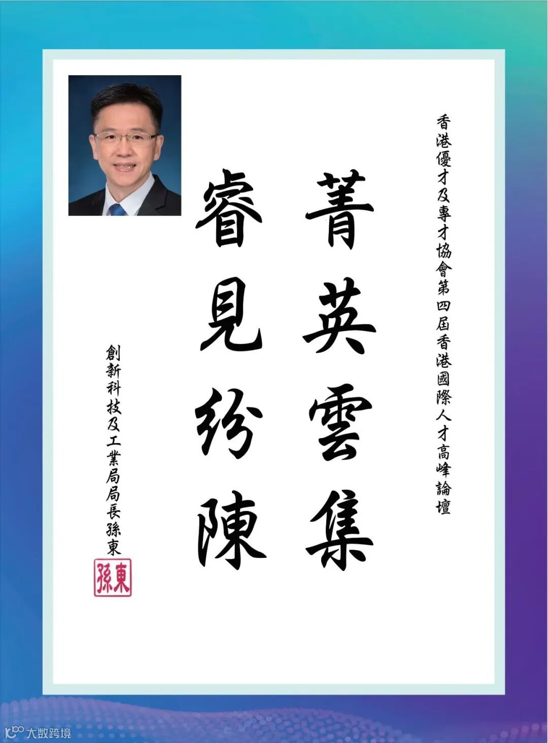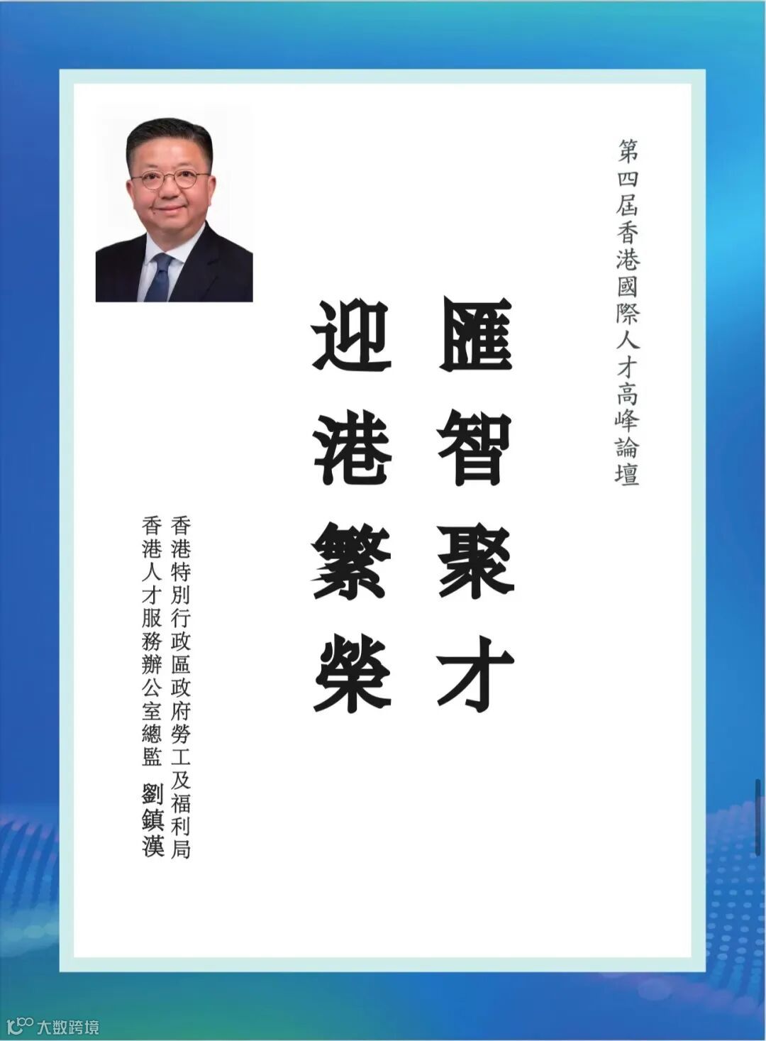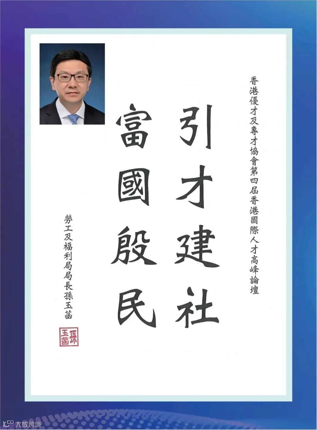 香港特別行政區勞工及福利局局長孫玉菡先生在致辭時回顧了近兩年香港「搶人才」的成果。展望未來,孫玉菡局長闡述了香港未來的人才政策走勢。他還強調了香港面臨的人才困難,諸如人口老化,勞動力不足等問題。他相信,香港的「搶人才」的政策會給本港經濟帶來發展。他希望香港在未來能更好地實施人才政策,與各地推動人才融合。