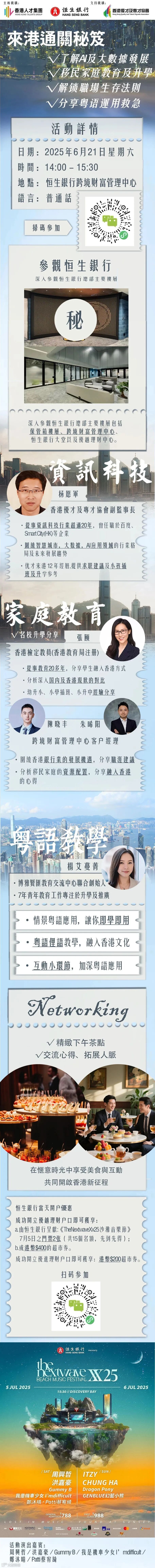 2025年夏,香港人才集團攜手恒生銀行,在香港優才及專才協會支持下即將舉行“新來港通關祕籍”主題沙龍活動。本活動聚焦AI與大數據,助力職場發展;同時分享粵語實用技巧,助力應急交流,並探討家庭教育與升學規劃。歡迎新來港人士參與,解鎖在香港的專屬通關密碼!