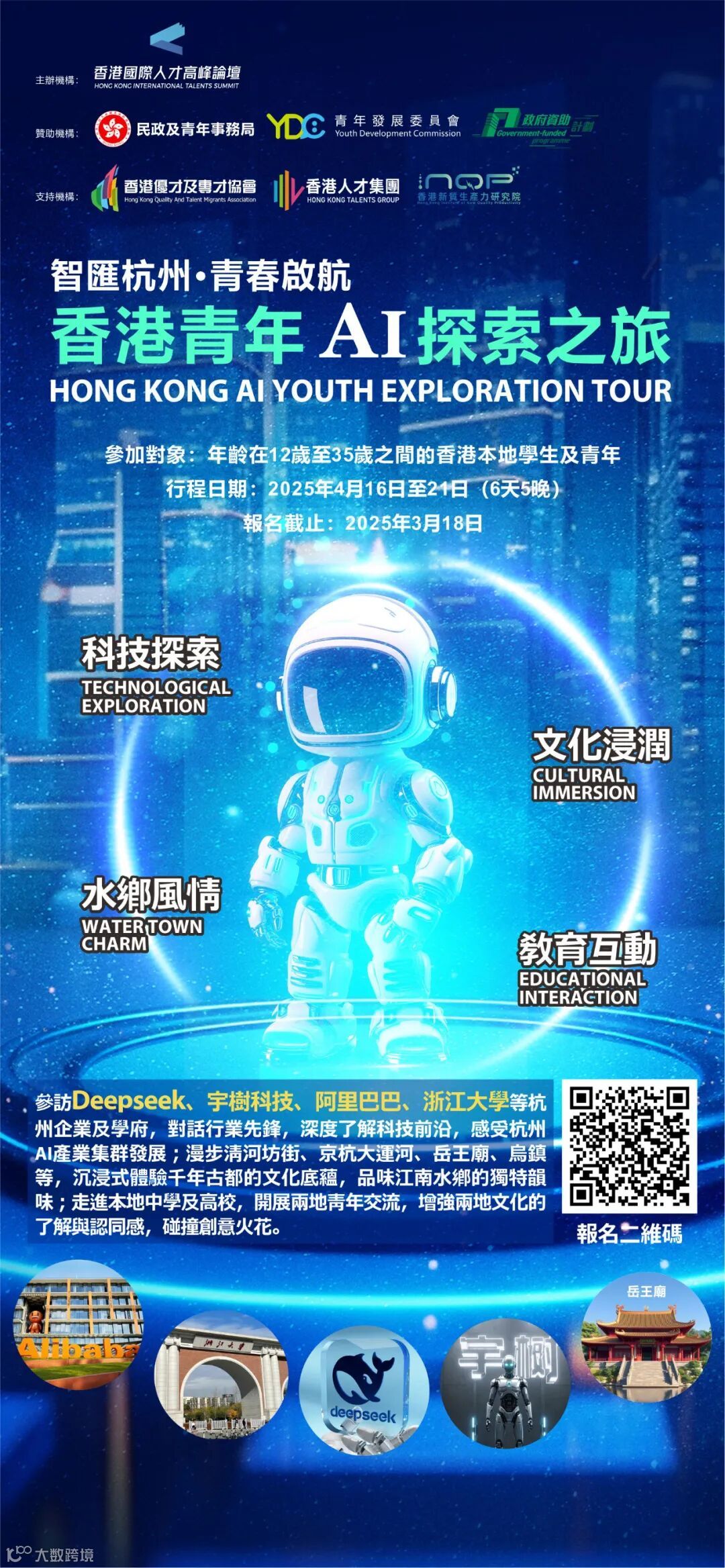 嘿,年輕的探索者們!你是否對人工智能充滿好奇?是否想親身體驗科技前沿的魅力?現在,機會來啦!我們誠摯邀請12歲至35歲的香港本地學生及青年,加入「智匯杭州·青春同行:香港青年AI探索之旅」,一起開啟這場不容錯過的從科技前沿到千年古韻的科技與文化碰撞的奇妙旅程!
