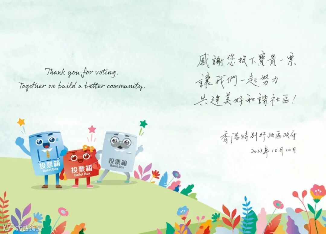 香港特區政府12月5日宣佈,為進一步傳揚區議會選舉信息,呼籲市民在投票日踴躍投票,並感謝市民的支持和與民同樂,投票當日,選民在投票後會獲派發一張「政府心意謝卡」,並在投票站旁設「打卡位」,讓市民可以拍照留念。當日投票站旁會有「打卡位」,放置一個由選舉吉祥物「票箱寶寶」,即「藍小寶」、「紅小寶」及「白爺爺」為構圖的展板,供市民合影留念,添選舉日氣氛。