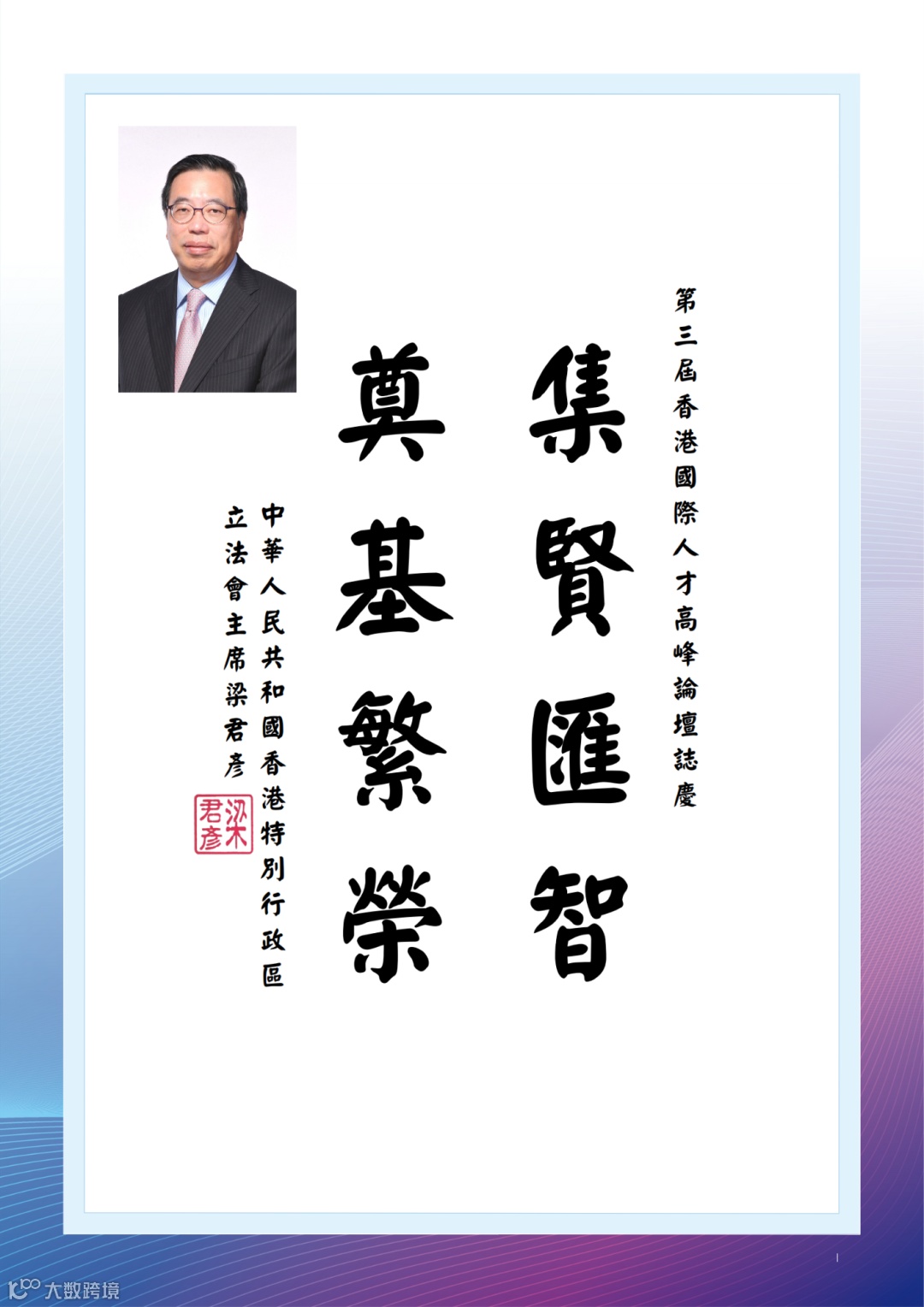香港特區李家超行政長官為論壇親筆題詞「英翹萃集,碩劃同商」,財政司長、立法會主席、行政會議召集人、13位局長及部門首長、入境處長、輸入優才及專才諮詢委員會主席、澳門特區政府人才發展委員會、全國人大及政協常委、香港各大學校長和馬來西亞公主等國際組織代表都揮毫題詞,對峰會給予充分肯定,為峰會活動錦上添花!