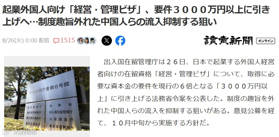 今年6月,日本出入国在留管理厅已着手讨论提高外国人创业签证门槛,其中特别提及或强化针对中国申请者的审查要求。