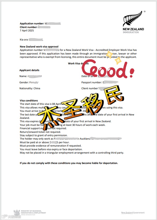 恭喜杰圣新西兰客户L女士4月7日成功获批六分制工签!