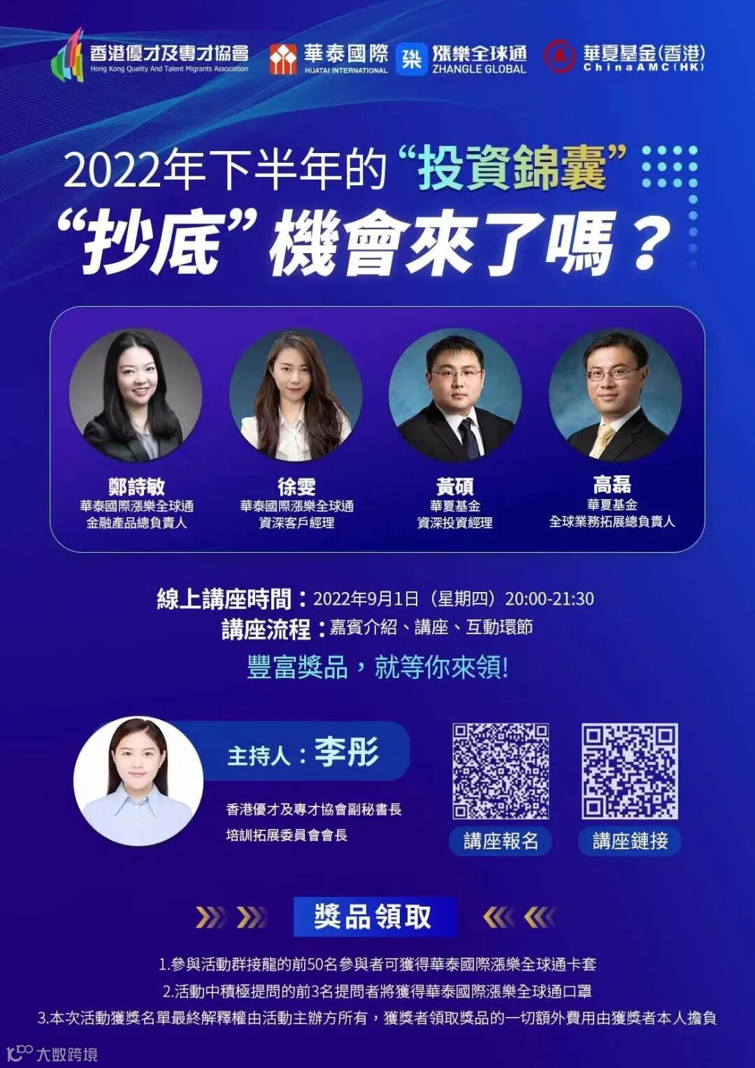 9月1日,香港優才及專才協會將與華泰國際聯合主辦線上講座,並有幸邀請到華泰國際漲樂全球通金融產品總負責人鄭詩敏、華泰國際漲樂全球通資深客戶經理徐雯、華夏基金全球業務拓展總負責人高磊及華夏基金資深投資經理黃碩擔任演講嘉賓,共同展望2022年下半年的金融市場機會,分享投資經驗。報名參與本次活動,更有豐富紀念品等你來領!