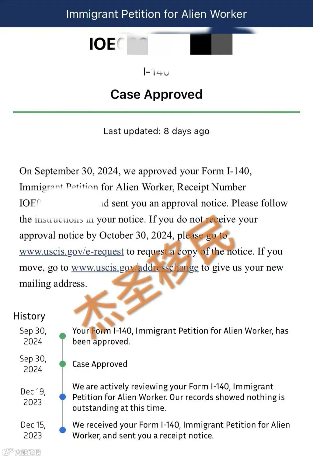 10月1日国庆日当天,杰圣移民客户X先生喜获美国杰出人才移民(EB-1A)批准函!