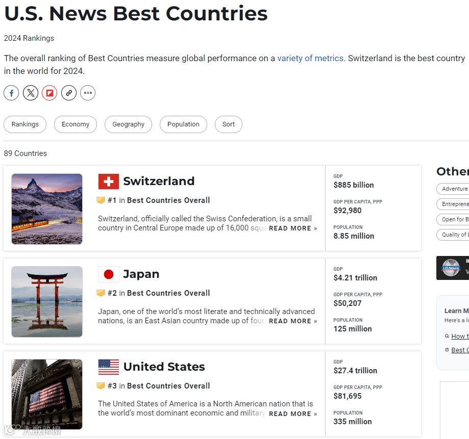 榜上,瑞士已经连续三年霸占了榜首位置,而第三到第五名的美国、加拿大和澳大利亚均是传统的热门移民国家,然而,相比较2023年美新周刊的全球最佳排名,日本为第第6位,一年之后的今天,日本一跃成为第二位则不可不令人感到惊叹。