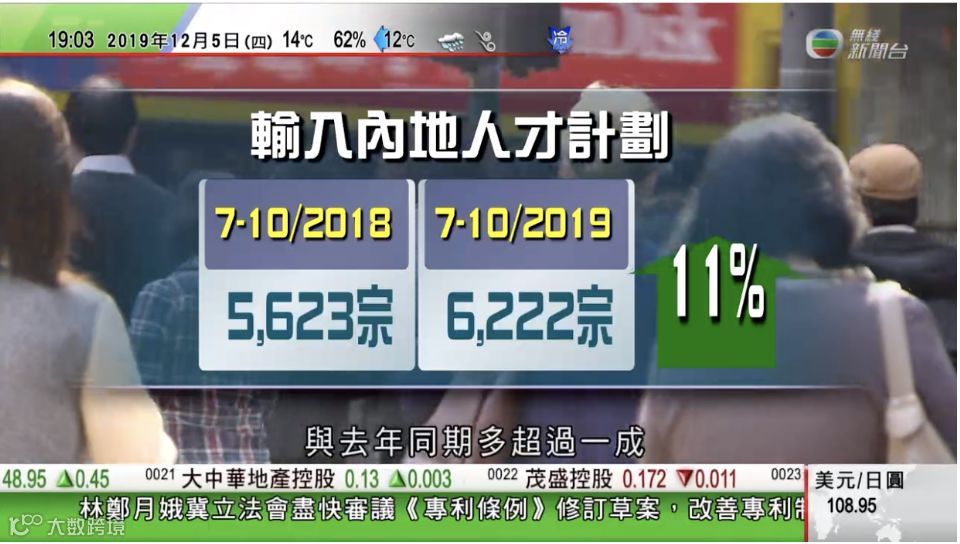 『輸入內地人才計劃』,截至今年十月,有1萬4千多宗申請,單是7至10月有6000多宗申請,與去年同期多超過一成。『非本地畢業生留港/回港就業安排』,今年7月至10月的申請人數均比去年同期增約一成;針對外籍人士的『一般就业政策』申请人数则未见明显增减。