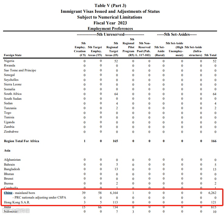 根据美国国务院的统计报告,在2023财年里(2022年10月1日 - 2023年9月30日),美国总共批准发放了9817张美国投资移民(EB-5)签证,在这获批的9817张签证里,来自中国大陆的获批申请人数为6262人,占比为63.8%;若再算上来自香港的121张获批签证,占比则为65.0%。这个结果充分显示了,中国高净值人群对于移民美国有着多么强烈的兴趣和执着。