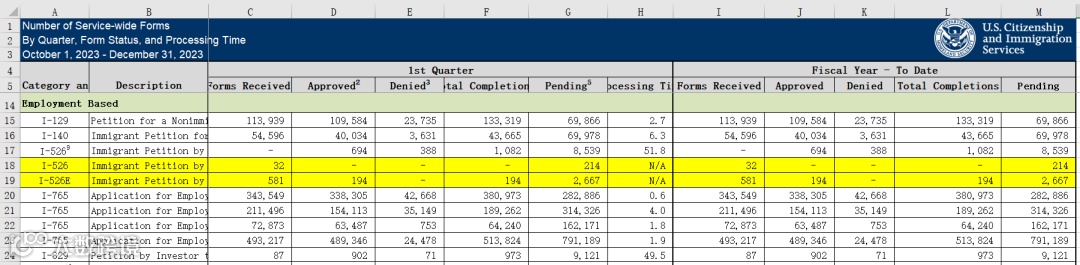 此图为美国移民局于2024年3月21日公布的收案统计数据。如图所示,在2023财年的第一季度中(即2023年10月1日 - 12月31日之间),美国移民局总共批准签发了194张I-526E申请,即新政下无排期的EB-5通道包含乡村预留项目、高失业区和基建项目。在23财年第一季度中,则收到了581份I-526E的申请,含I-526则为总共613份申请。