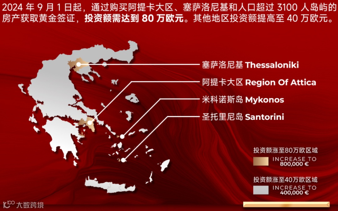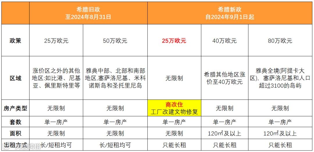 在2024年4月2日,希腊政府通过了“黄金签证”修正案,宣布自2024年9月1日起:雅典全境(阿提卡大区),塞萨洛尼基和人口超过3100的岛屿,涨至80万欧元;希腊其他地区涨价至40万欧元;25万欧元可以购买商业改建而成的住宅—简称“商改住”项目。