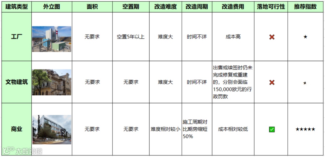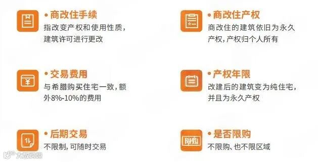 希腊新政25万欧元购房拿身份的不动产项目,包含工厂、商业、文物建筑改造成住宅类建筑,但是需注意,工厂建筑需要空置5年以上。其中“商改住”项目指的是申请人通过购买商业房产并进行产权证照变更,由商业地产改造为住宅地产,以满足“黄金签证计划”新政的资格条件。