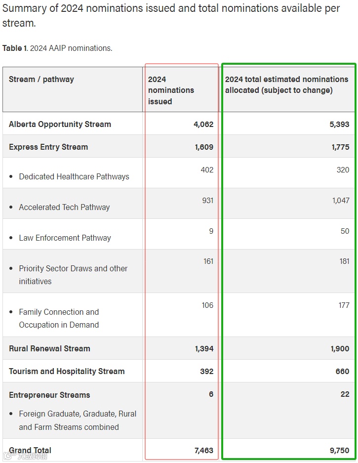 上图(图-1)是阿省移民局给出的截止到9月4日的2024年全部省提名名额发放情况。其中红线所框的部分为各移民项目通道已发放的省提名份数,绿线所框的部分为预估的各个项目通道所分配的年度总体配额。