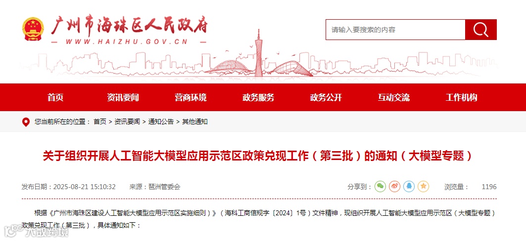 根据《广州市海珠区建设人工智能大模型应用示范区实施细则》(海科工商信规字〔2024〕1号)文件精神,现组织开展人工智能大模型应用示范区(大模型专题)政策兑现工作(第三批),具体通知如下: