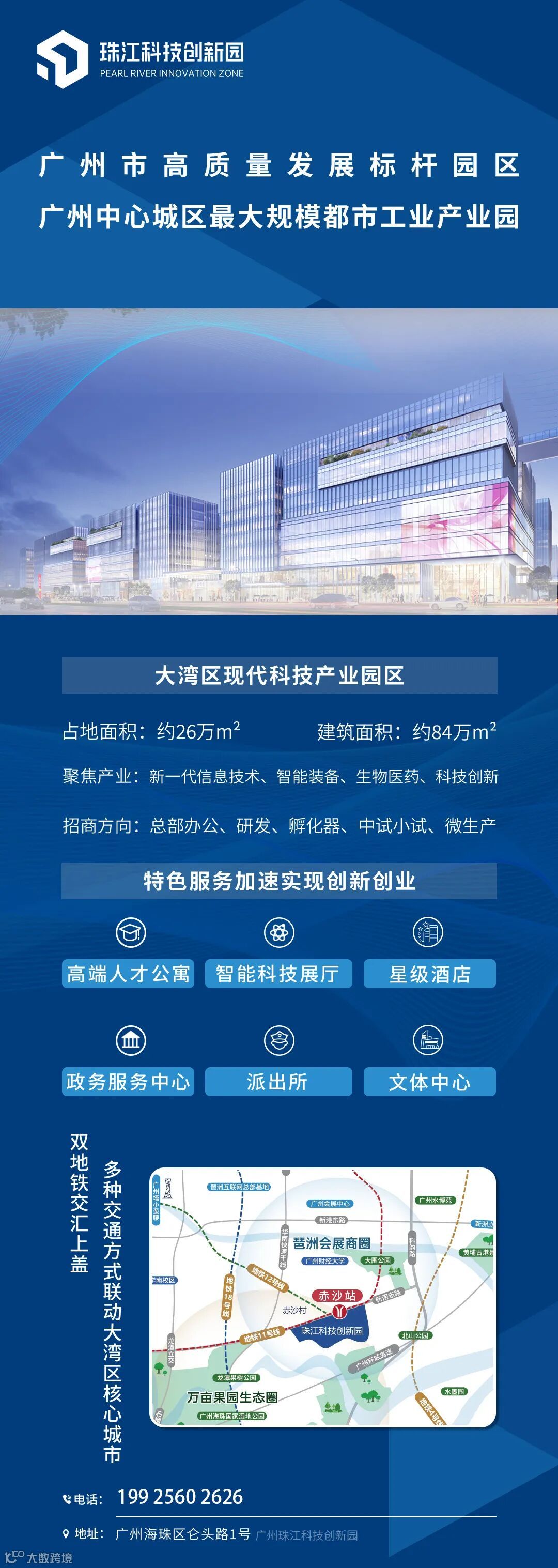 珠江科技创新园位于广州市海珠区新滘东路以南,仑头路以西路段,紧邻万亩果园、海珠国家湿地公园,北临琶洲会展商圈,西面紧靠海珠区政府及中大纺织城。园区总建设用地面积约26万㎡,总建筑面积约78万㎡,计划总投资77亿元。园区是海珠区现存最大规模,也是广州中心城区面积最大的都市工业产业园。广州“十四五”规划重点项目、2024年广州重点建设项目计划、广州市高质量发展标杆园区。园区享受广州市高质量发展标杆园区及海珠区都市工业园区专项扶持政策。
