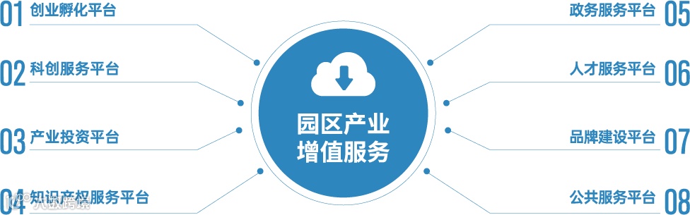 园区全力打造高品质产业服务平台,为入驻企业提供创业孵化、科创服务、产业投资、知识产权服务、人才服务、品牌建设、公共服务、政务服务八大增值服务,以硬件到位、软件落实的一站式全方位服务,减少企业运营成本。