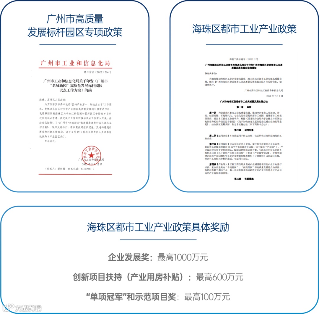 园区是海珠区现存最大规模、也是广州中心城区面积最大的都市工业产业园区,广州“十四五”规划重点项目、2024年广州市重点建设项目计划、广州市高质量发展标杆园区。园区享受海珠区都市工业园区及广州市高质量发展标杆园区的专项扶持政策。