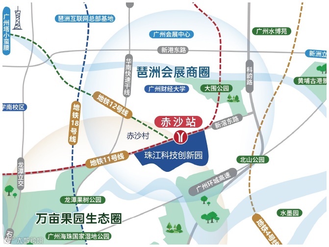 园区位于广州主城核心区、琶洲人工智能与数字经济试验核心南区、粤港澳大湾区科技创新产业链之轴心,北临琶洲会展商圈,西面紧靠海珠区政府及中大纺织城,距离广州大学城仅2.5km,广州地铁11、12号线换乘站“赤沙站”就在园区内,出门即两个公交车站,共12条公交线路停靠。