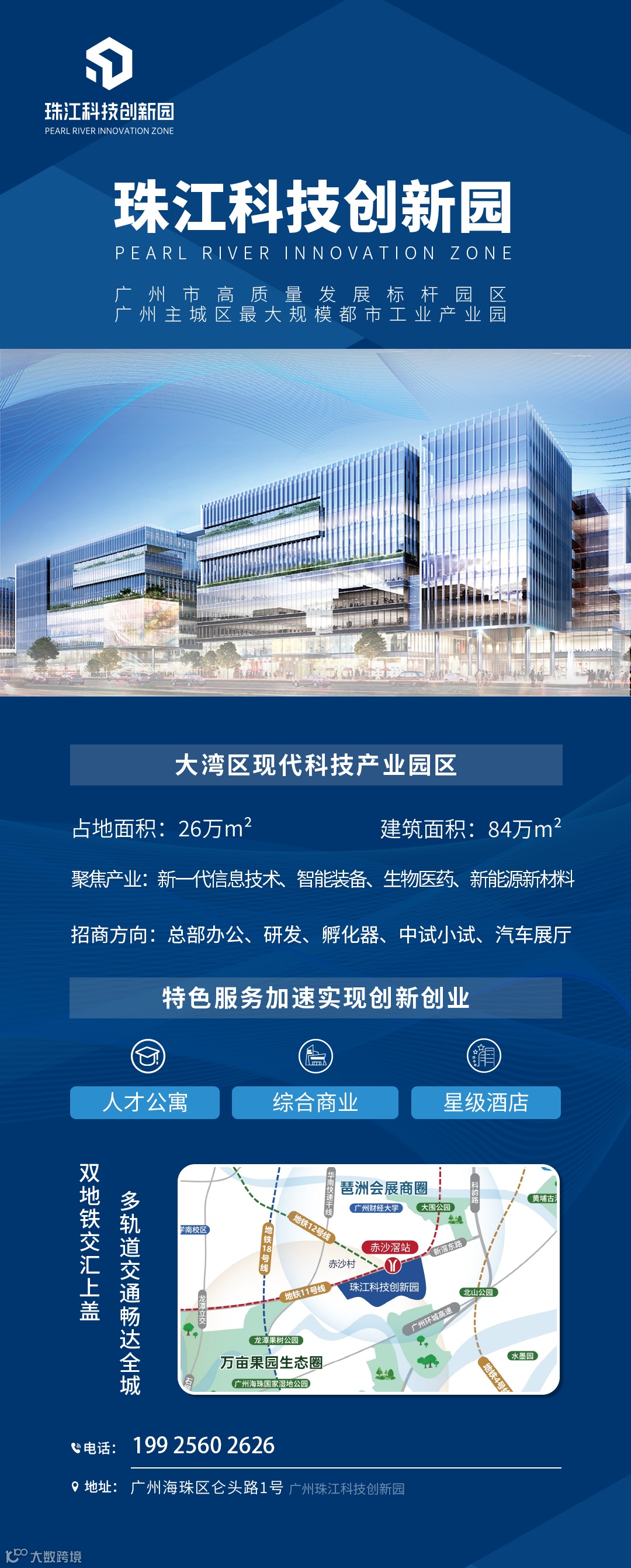 珠江科技创新园位于广州市海珠区新滘东路以南,仑头路以西路段,紧邻万亩果园、海珠国家湿地公园,北临琶洲会展商圈,西面紧靠海珠区政府及中大纺织城。园区总建设用地面积约26万㎡,总建筑面积约84万㎡,计划总投资77亿元。园区是海珠区现存最大规模,也是广州中心城区面积最大的都市工业产业园。广州“十四五”规划重点项目、2024年广州重点建设项目计划、广州市高质量发展标杆园区。园区享受广州市高质量发展标杆园区及海珠区都市工业园区专项扶持政策。