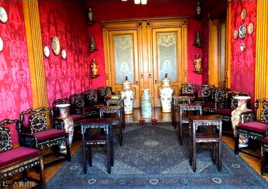 有意思的是,里面还设有一个“中国室”,陈列着我国清朝慈禧太后于1910年为纪念墨西哥独立100周年赠送的一套红木家具、5个荷花图案的瓷瓶和4幅用贝壳镶嵌而成的风景画。