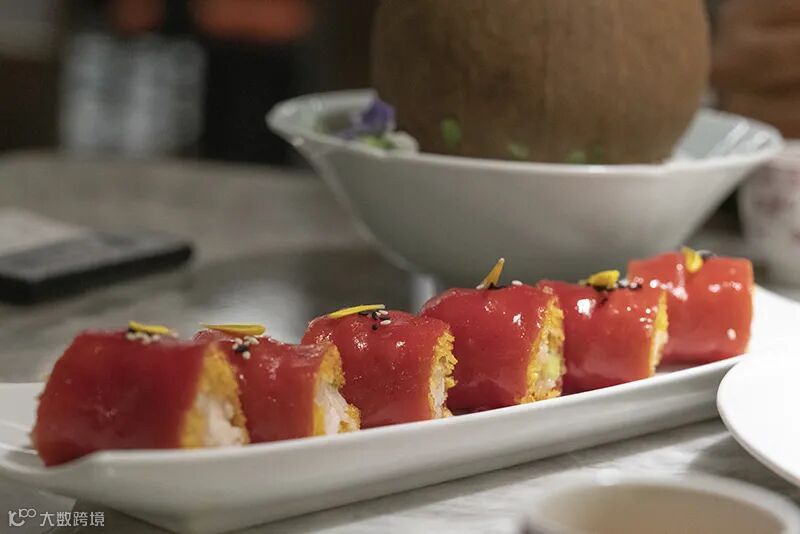 在海珠区的香格里拉大酒店,出品红米肠已有13年历史,主厨陈国雄师傅早在2003年开始就不断地尝试改良传统肠粉,花四年研制个人秘方改良制作出脆皮鲜虾红米肠。据说这里诞生的红米肠是全广州第一条,所以这里的红米肠取名“始创红米肠”。