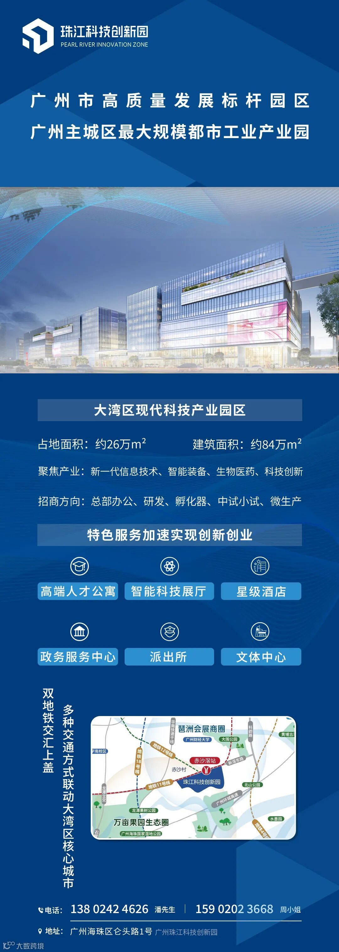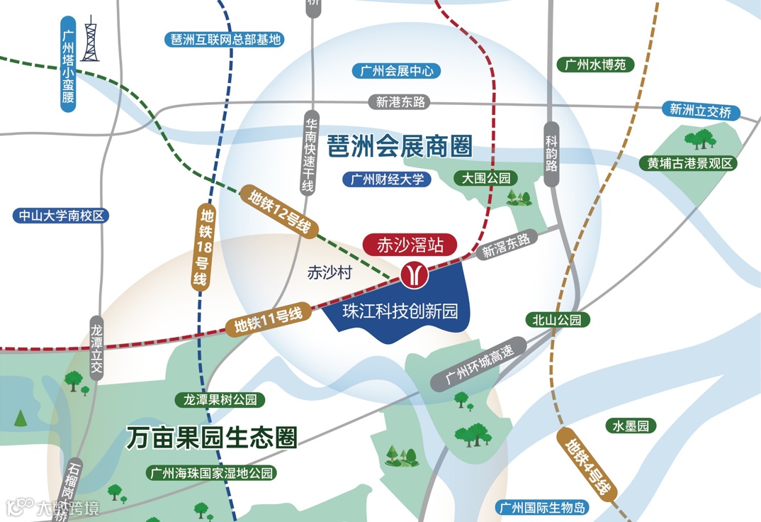 珠江科技创新园位于广州主城核心区,琶洲人工智能与数字经济实验区南片区,园区地理位置优越,紧邻万亩果园、海珠国家湿地公园,广州地铁11号线、12号线“赤沙滘站”上盖园区,12条公交线路停靠,距大学城仅2.5公里,可实现10分钟抵达高铁广州南站、30分钟直达广州白云国际机场、2小时抵达港澳,无缝对接大湾区核心城市,便利商务往来,为企业发展加速。