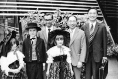 作者周振东陪(后排左一)团员和随团的驻欧共体使团三等秘书陈起元(右一)等参观。