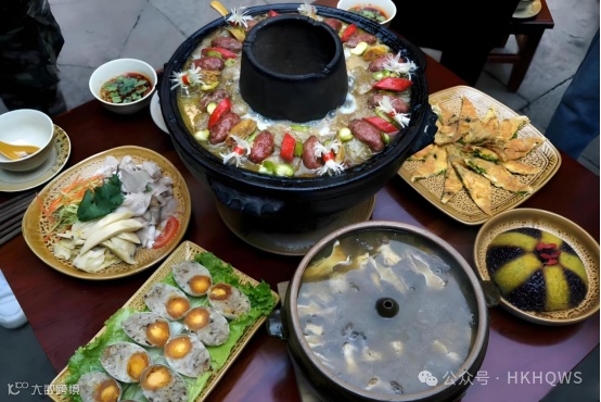 土陶锅中,酥肉、黄笋、蛋卷等六种食材与骨头汤共烩,小火慢煨三四个小时。汤汁浓缩了山珍的精华,每一口都是时间的味道,被誉为“舌尖上的火山热海”。