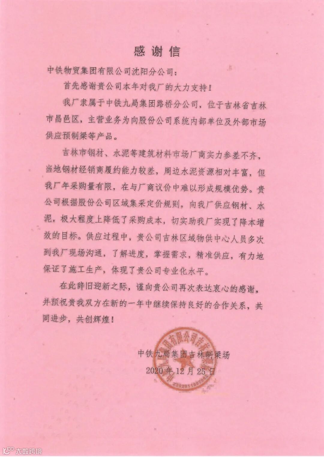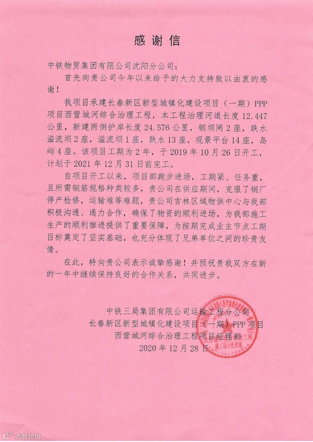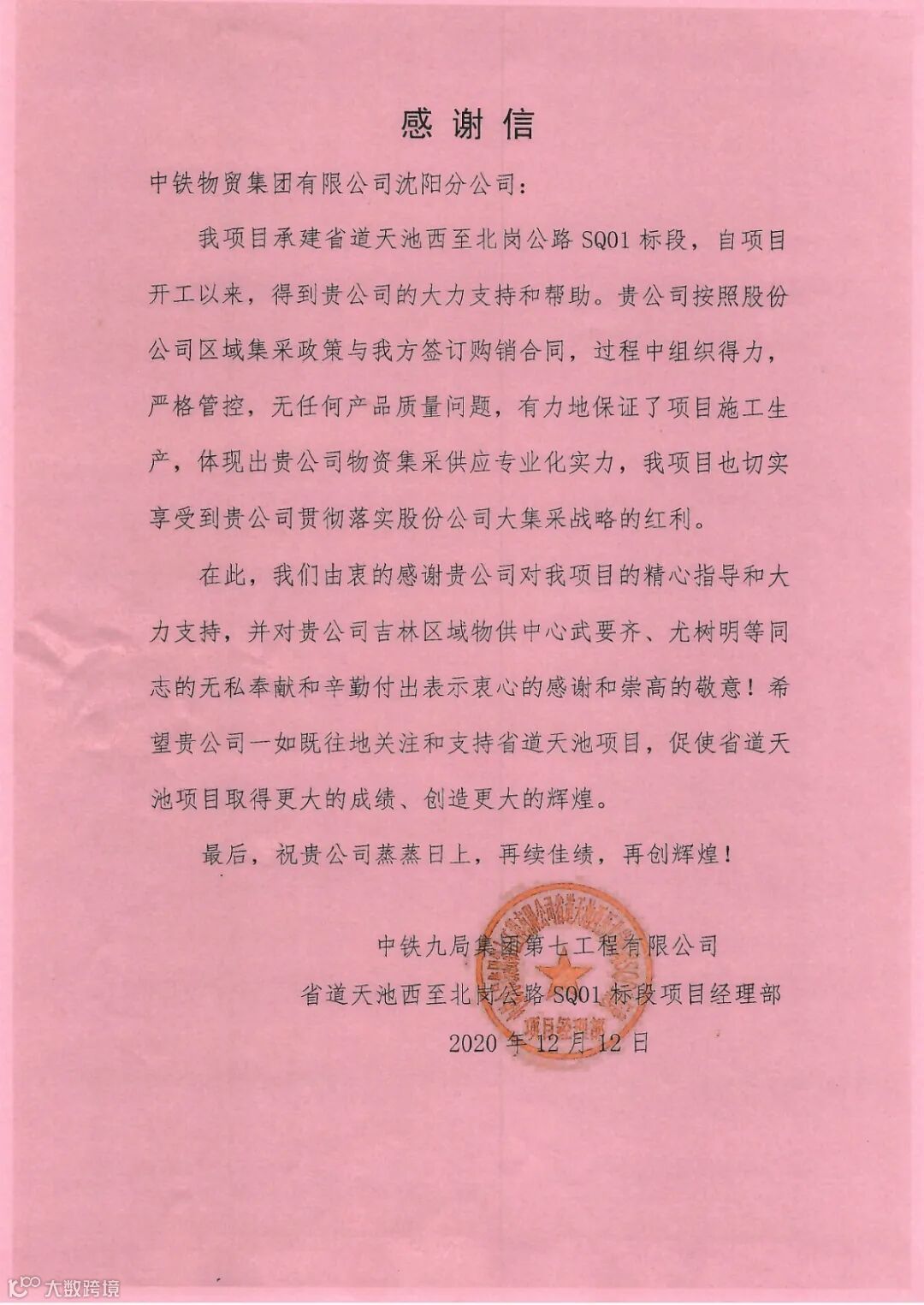 沈阳分公司吉林区域物供中心陆续收到来自九局抚松省道天池公路项目、九局吉林制梁场项目、三局四公司松原棚改项目、三局运输公司河道治理项目感谢信,信中对沈阳分公司在区域集采物资供应服务过程中克服重重困难所付出的努力和支持表示诚挚的感谢并表示在接下来的合作中继续精诚合作,互利共赢。