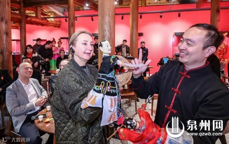 2月11日下午,明媚的阳光倾洒在泉州的大街小巷,外国总领事们正式开启了他们充满期待的泉州初印象之旅——参观泉州非物质文化遗产馆。一踏入馆内,众人仿若步入一条时光回廊,厚重的历史气息裹挟着文化韵味扑面而来。馆内,琳琅满目的非遗展品有序陈列,提线木偶栩栩如生,闽南金苍绣精美的针法巧夺天工,这些非遗精品让总领事们眼前一亮。他们忍不住走上前,向技艺精湛的艺人们学习木偶操作,感受其中的奇妙乐趣。