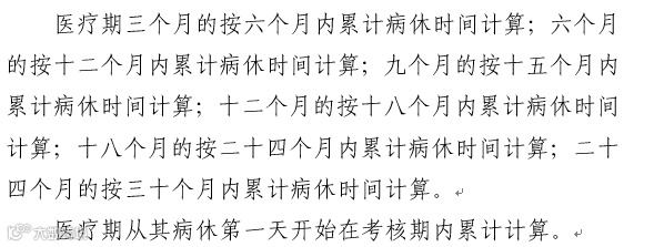 员工因患病或非因工负伤需要停止工作医疗时,根据本人实际参加工作年限和本单位工作年限,给予三个月到二十四个月医疗期: