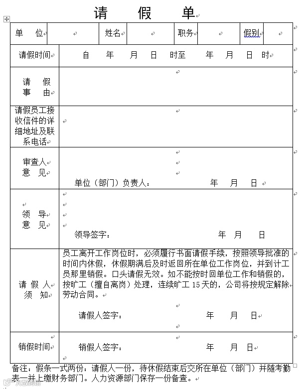 员工因私事请假,需提前填写请假单,经领导批准后方可离岗办事,否则按旷工处理。员工请事假期间,不支付工资。