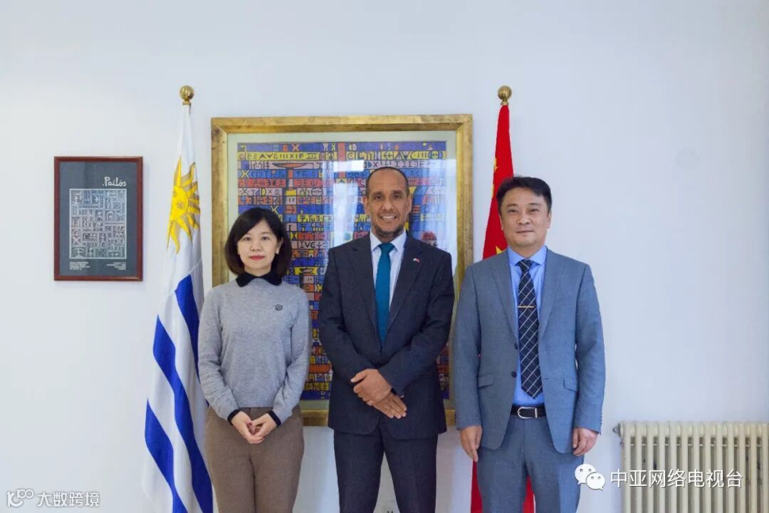 乌拉圭驻华大使馆领事塞尔西奥·德亚巴列(中)中亚网络电视台总编辑刘奕先生(右)中亚网络电视台副台长魏欢(左)