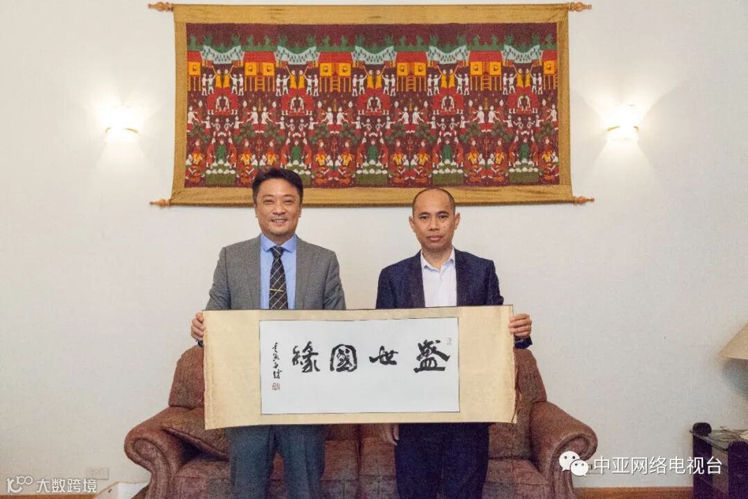 中亚网络电视台总编辑刘奕(左)与柬埔寨王国驻华大使馆二等秘书李财(右)