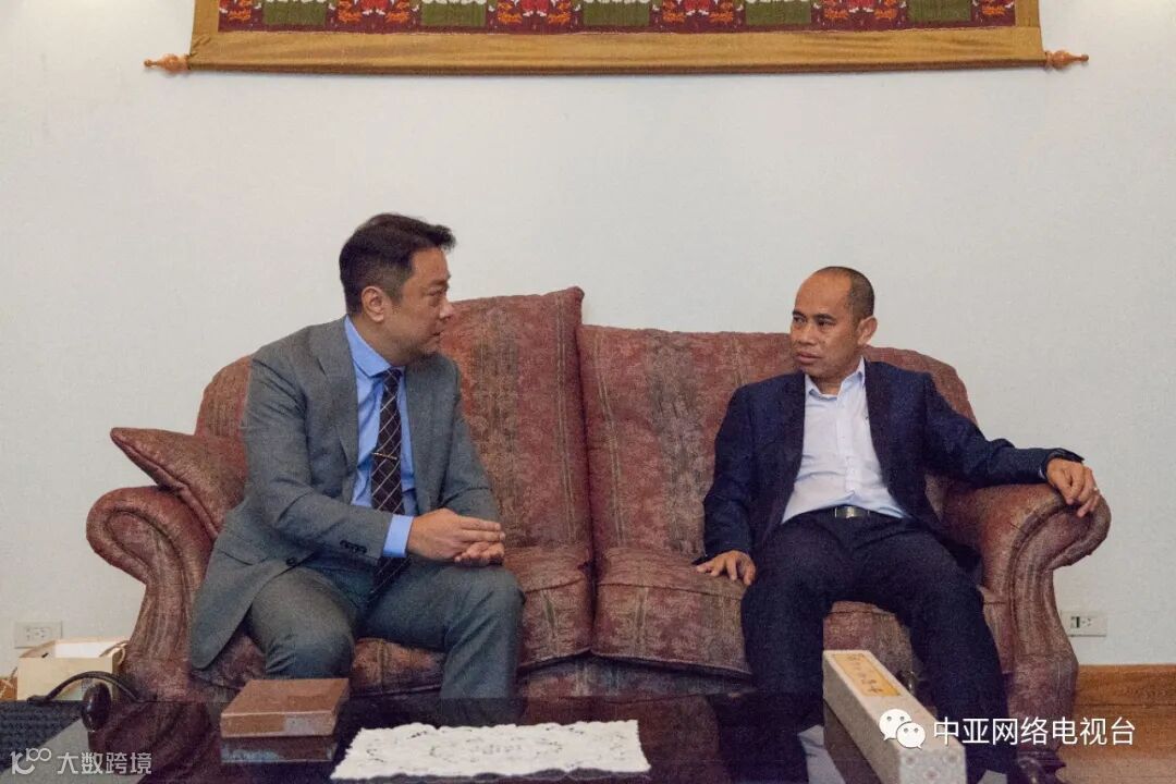 柬埔寨王国驻华大使馆二等秘书李财(右)与中亚网络电视台总编辑刘奕先生(左)会面交流现场