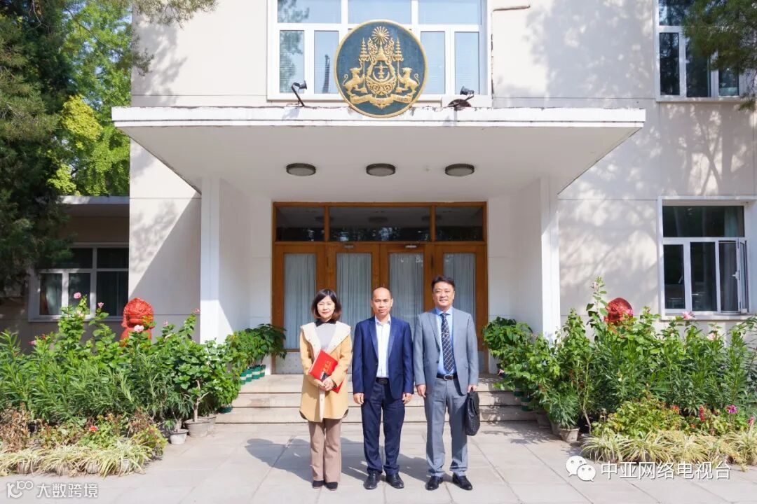 柬埔寨王国驻华大使馆二等秘书李财(中)中亚网络电视台总编辑刘奕先生(右)中亚网络电视台副台长魏欢(左)
