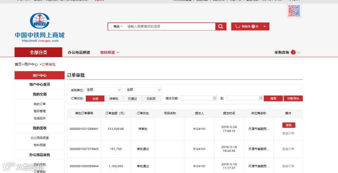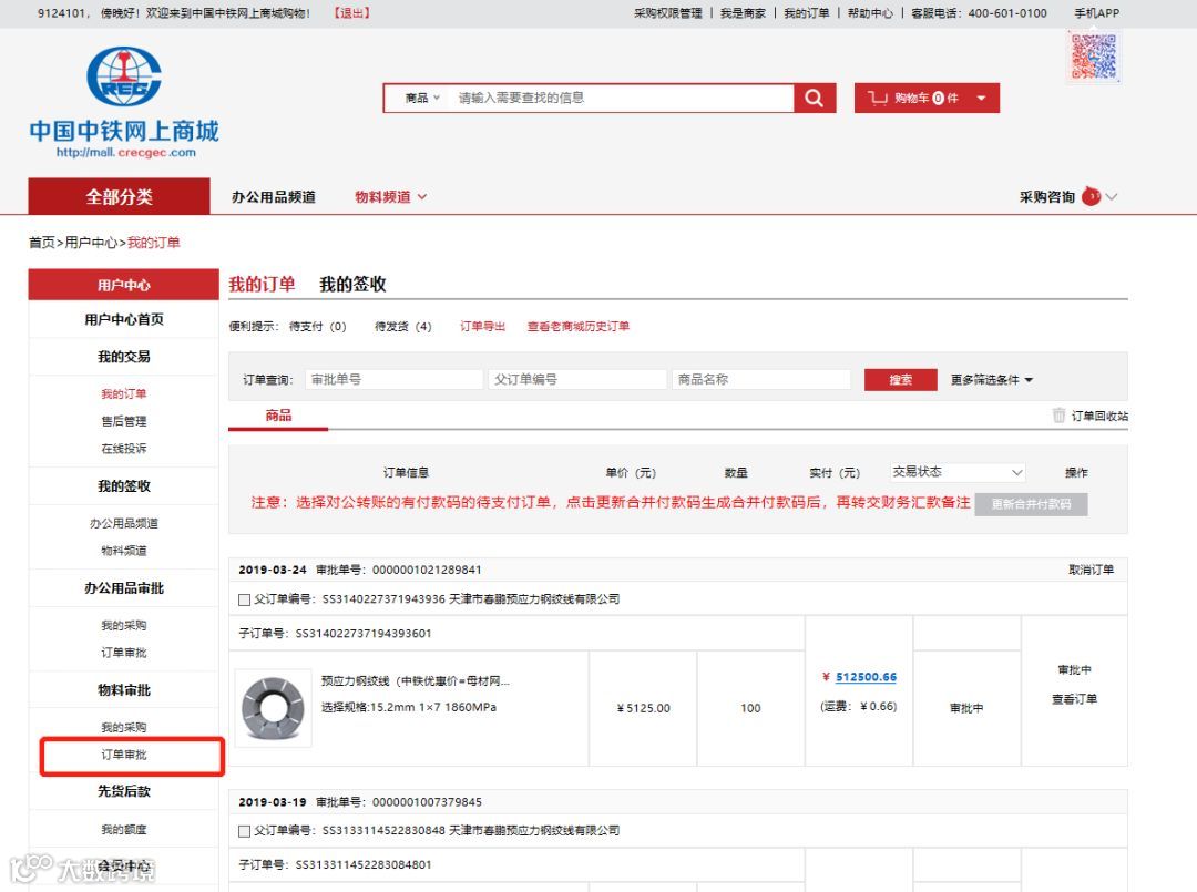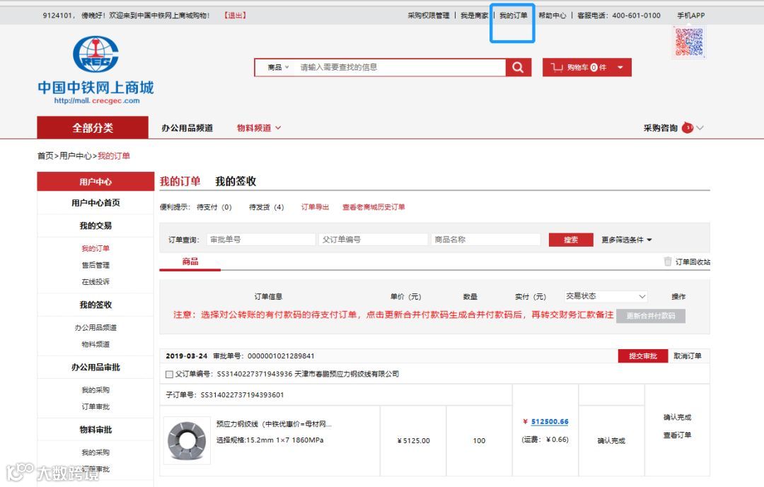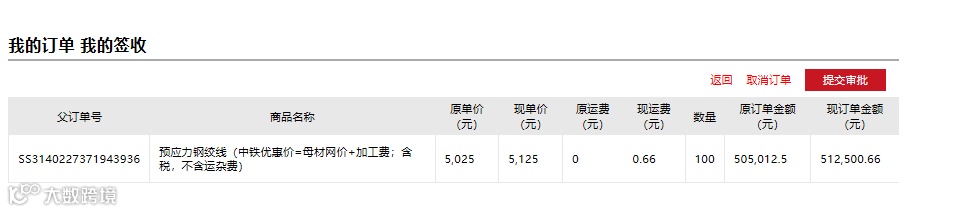 采购方确认价格,点击“我的订单”选择“提交审批”。