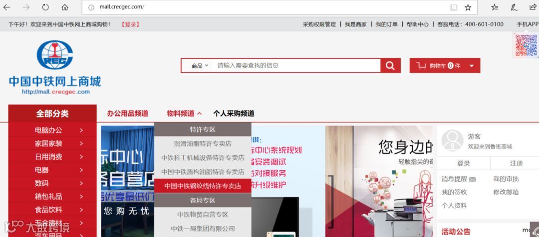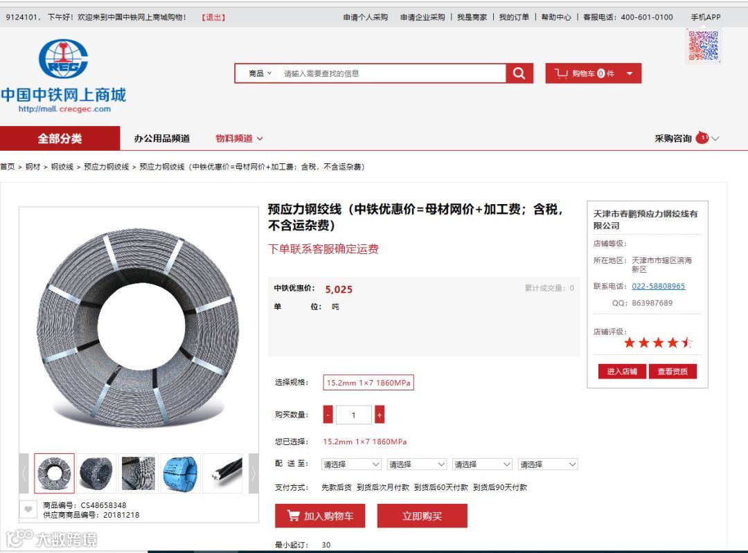 登录“中国中铁网上商城”,选择“物料频道”下的“中国中铁钢绞线特许专卖店”