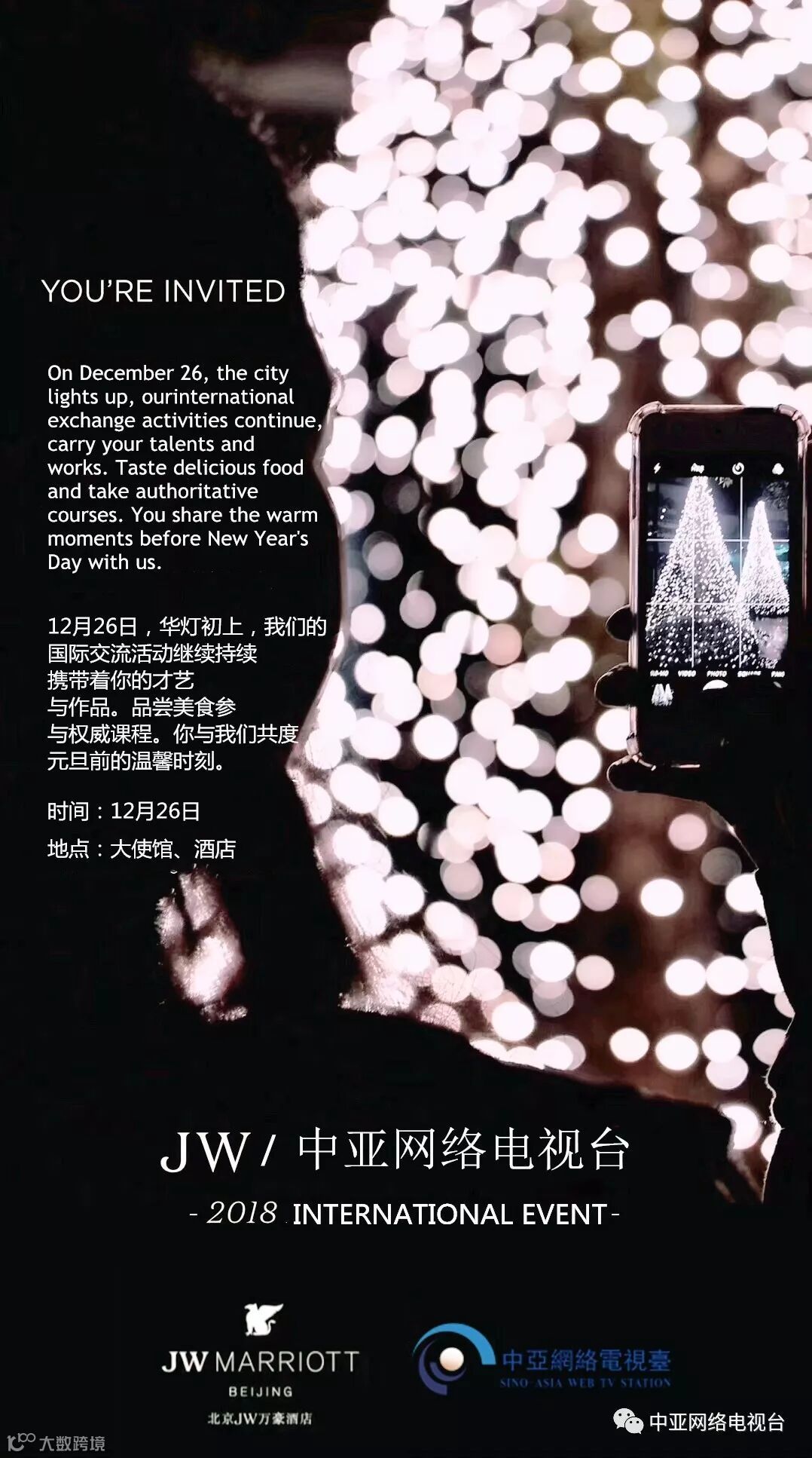 2018年11月29日,JW万豪酒店携手中亚网络电视台举行圣诞点灯仪式。
