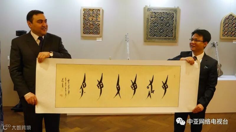 活动现场,上合组织秘书长拉希德·阿利莫夫阁下接受我台采访,并强烈推荐采访了活动现场展览阿塞拜疆的当代艺术家fidan kim女士。在秘书长阁下的要求和见证下,由fidan kim女士受赠我台赠送的中国女书作品,该幅由江永非遗传承人胡欣书写的“开放 合作 共赢”!