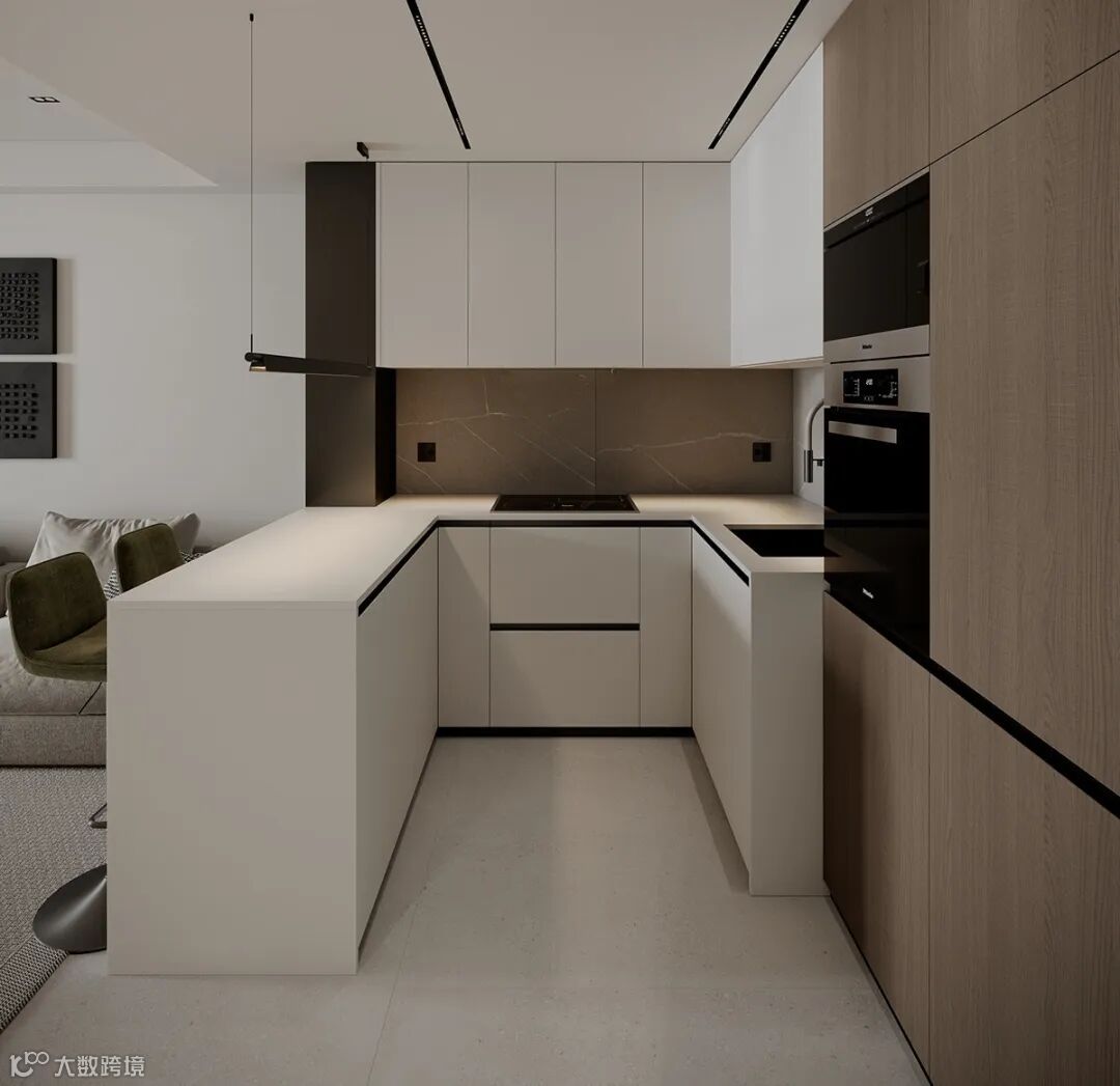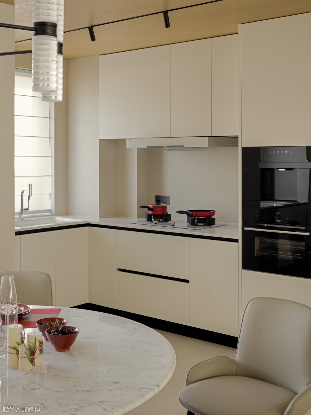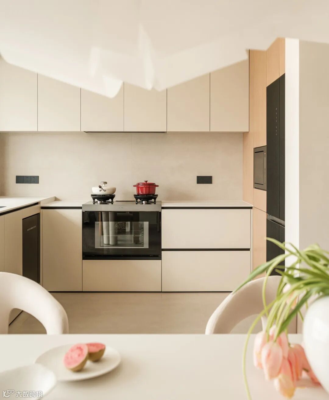 白色与木色交织,简约又高级,柜体设计利落,收纳力拉满,搭配嵌入式家电,整体感十足,为厨房营造出舒适又有格调的氛围。