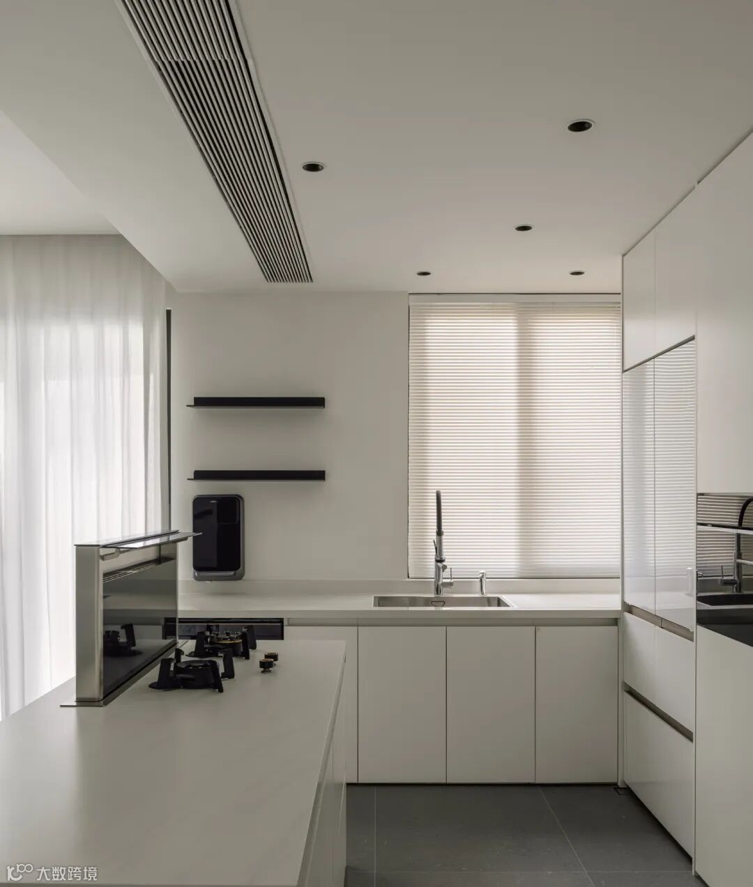 以纯净的白色为主色调,开阔又明亮,同时,巧妙利用空间,将收纳能力拉满,既契合现代家居的审美,又为烹饪生活带来便利。