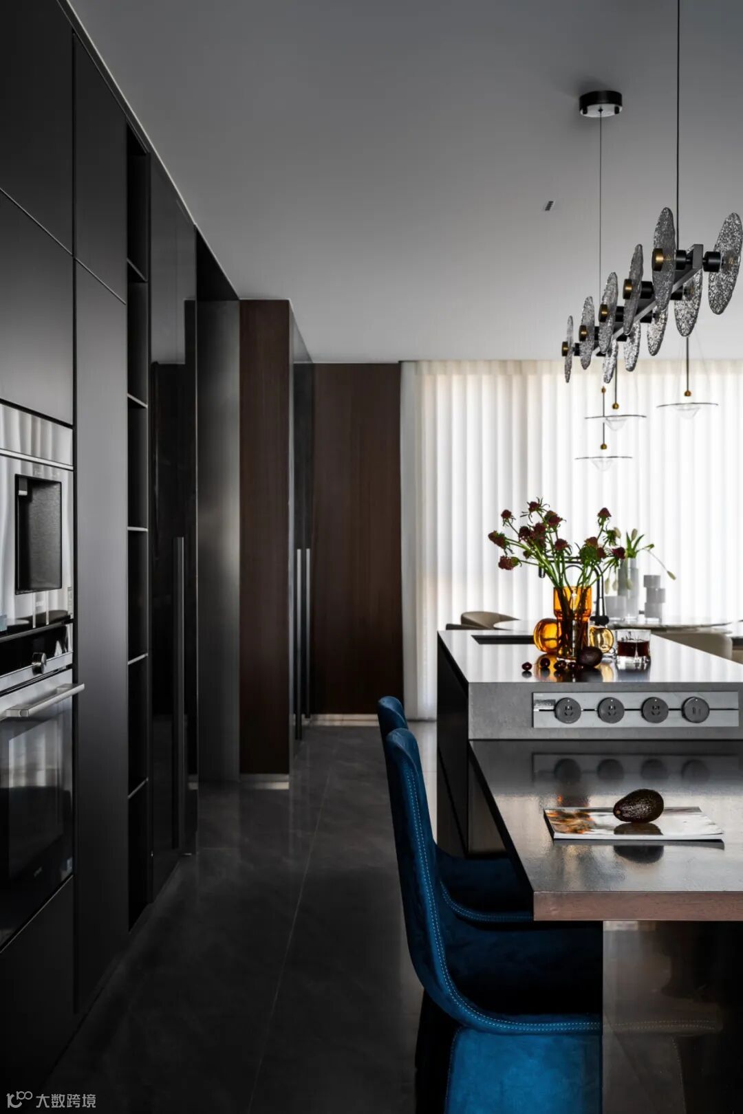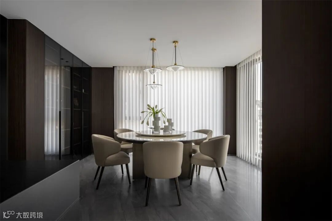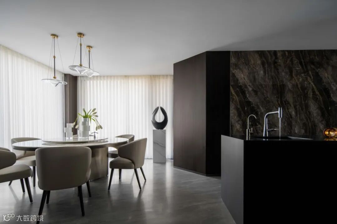 岛台与中厨紧密相连,流畅的动线设计,实现烹饪与备餐的高效互动,岛台延展出的餐桌与圆形餐桌并置,营造出一个功能完备且极具生活质感的餐厅空间。