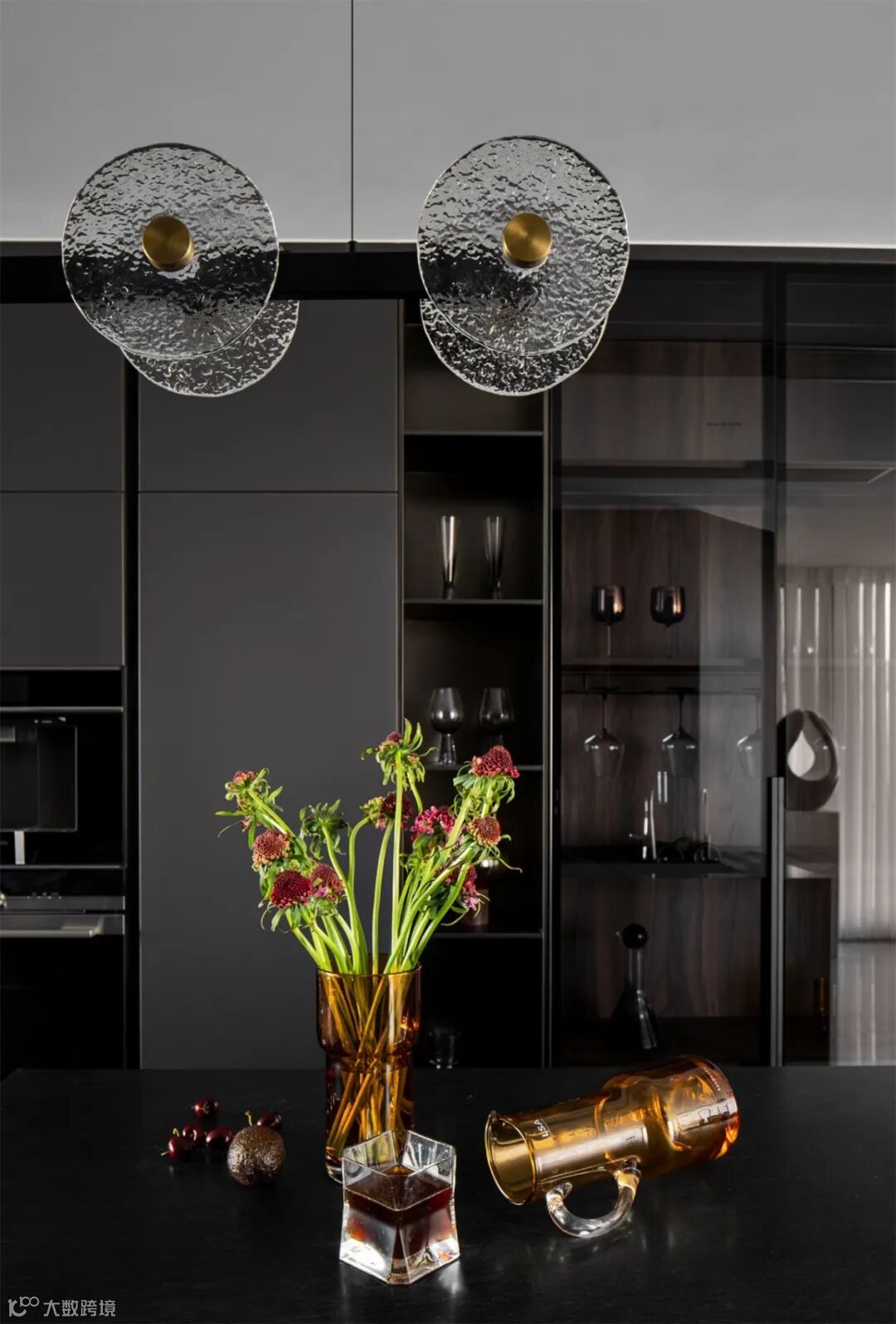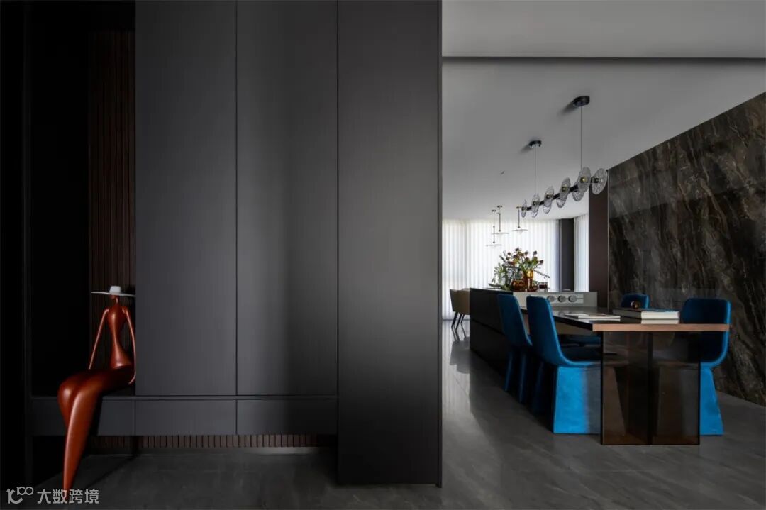 将孔雀蓝的神秘、铜色的复古、银色的现代、灰色的沉稳,以及透明玻璃的通透,共同交织出层次丰富的视觉效果。