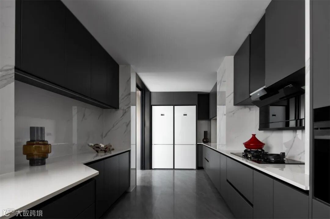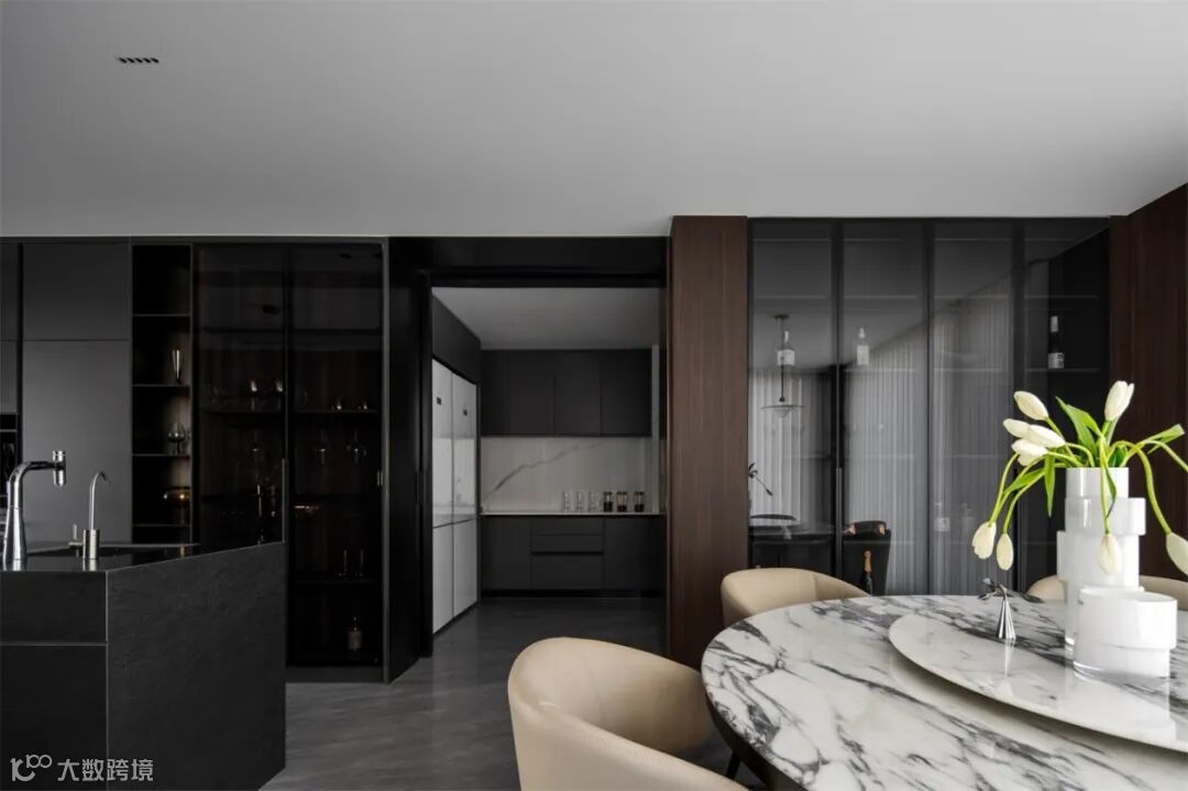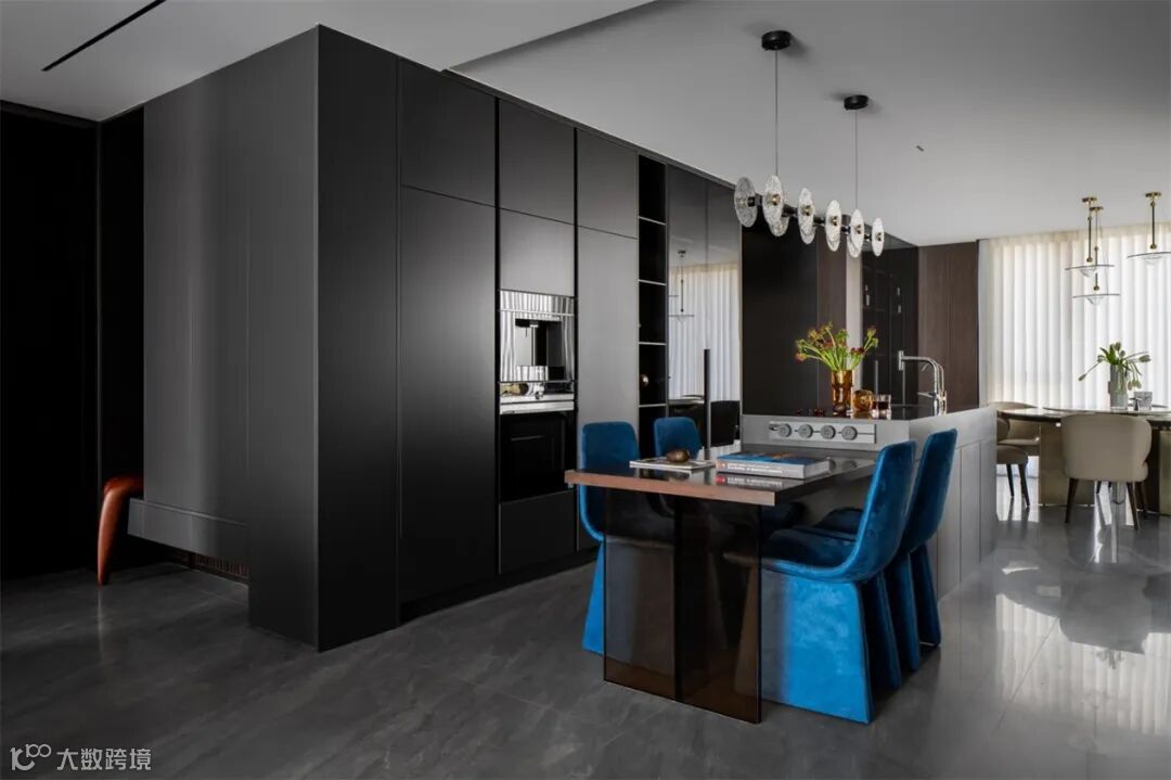 开放式厨房与餐厅一体化空间。以简洁的黑、灰为主色调,通过开放式布局融合烹饪、用餐功能,营造出流畅互动的生活场景。