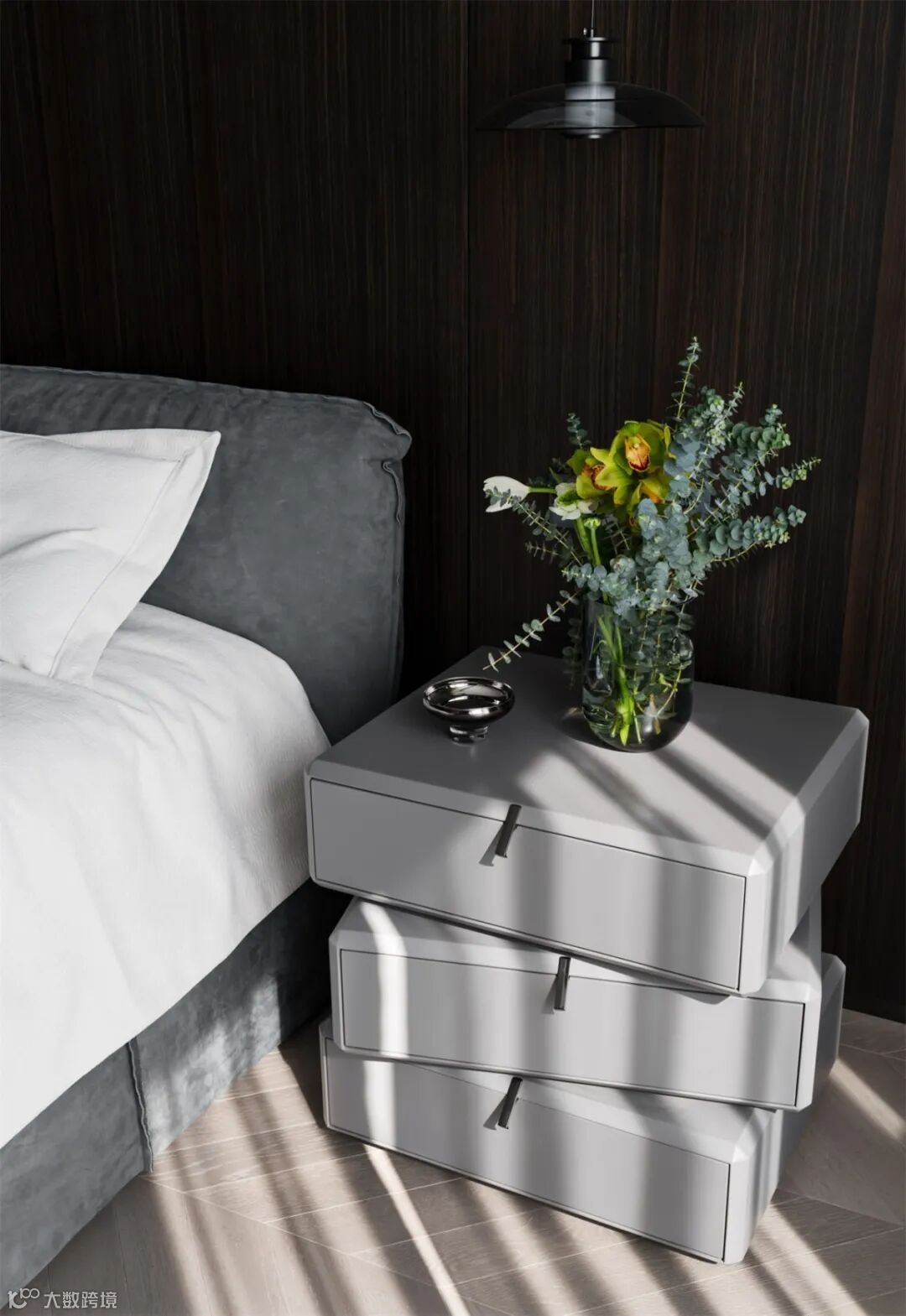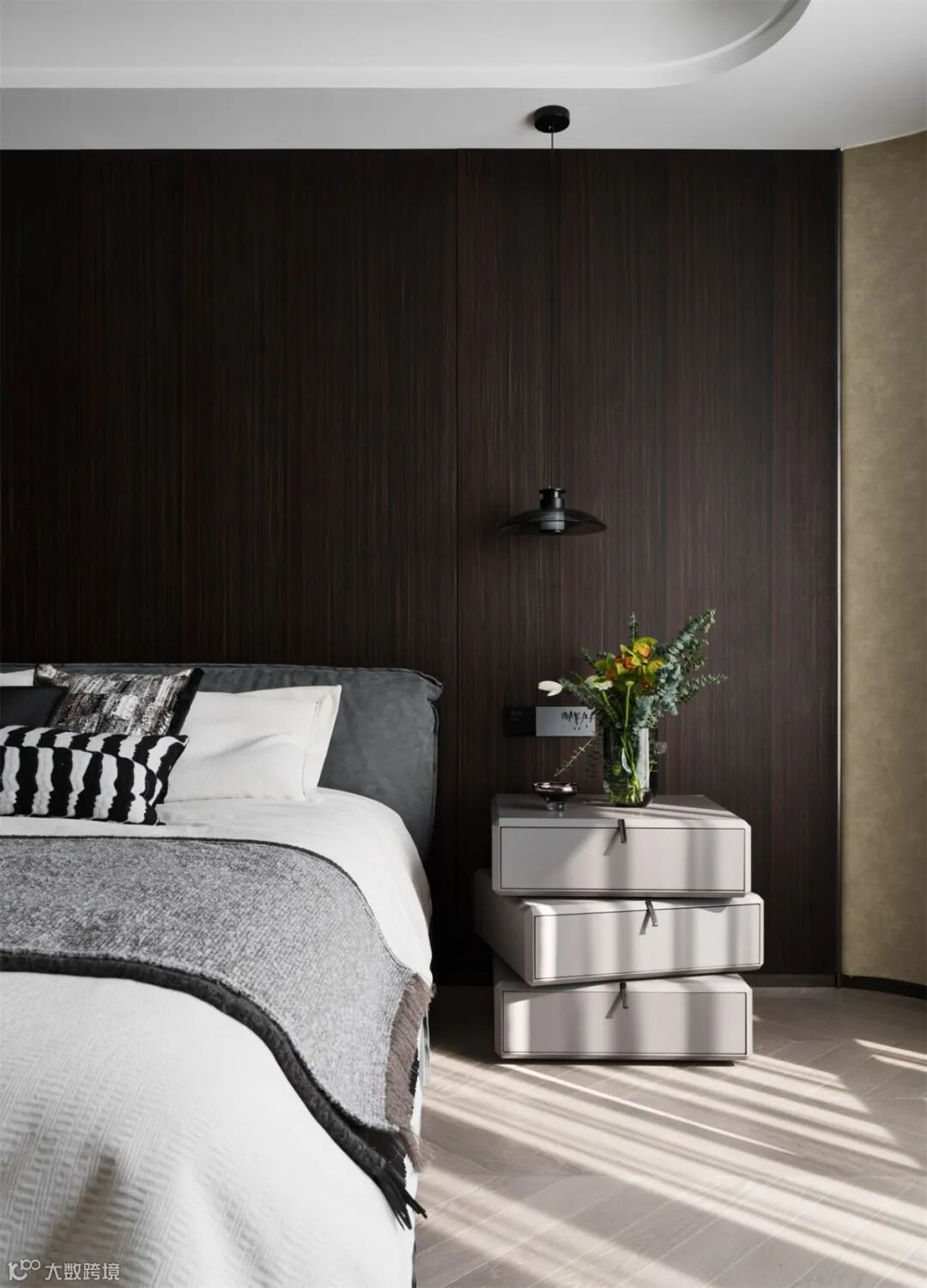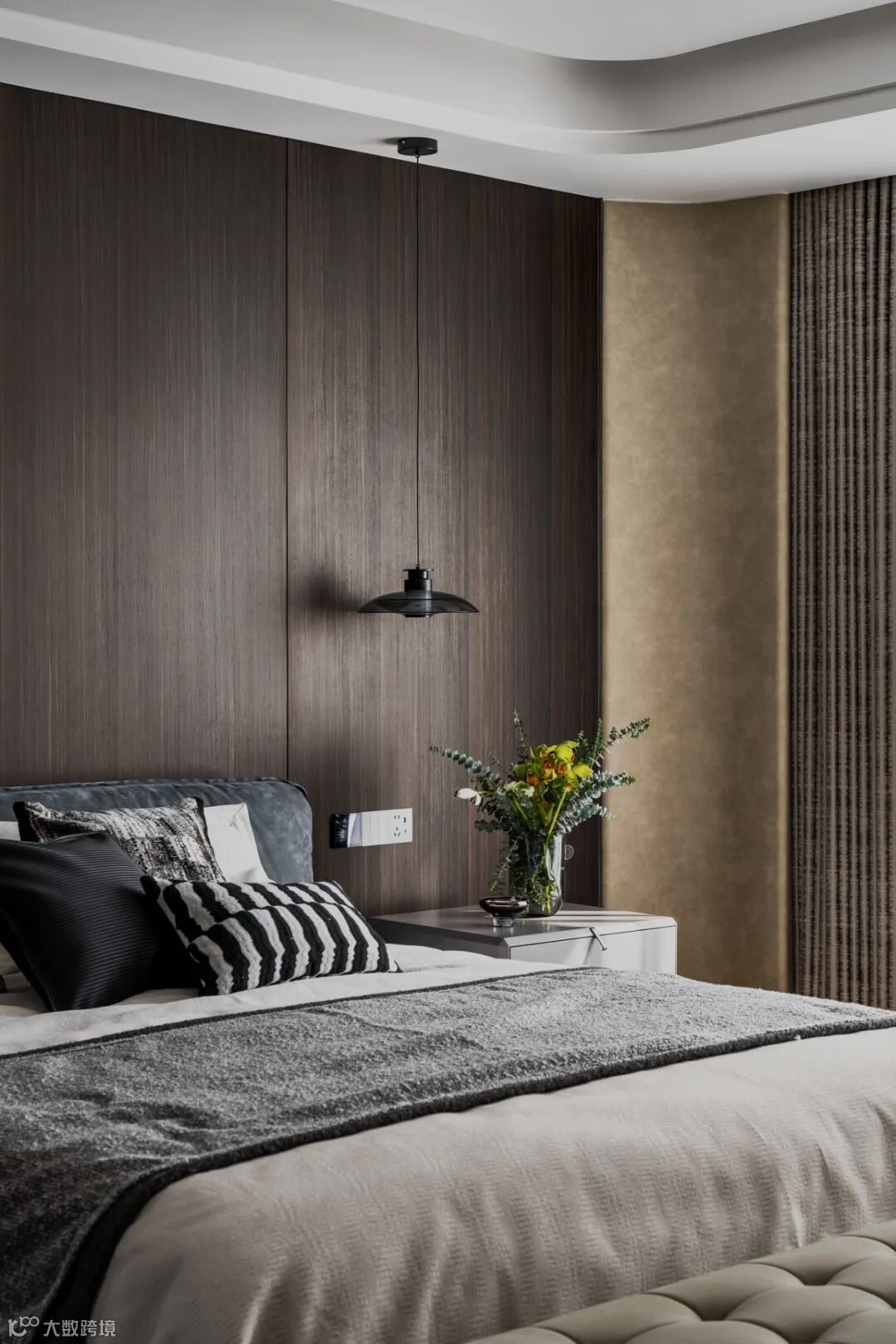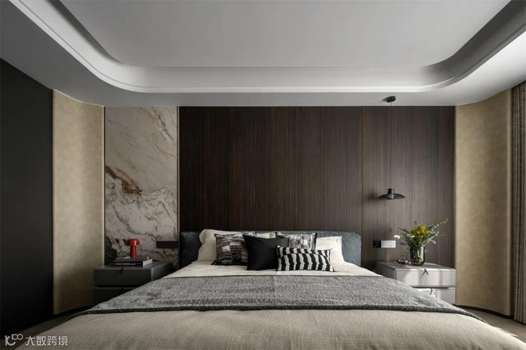 深色木质背景墙勾勒沉稳边界,悬浮吊灯如夜的注视。每一寸设计,都是克制与精致的博弈,把高级感揉进日常休憩,让睡眠成为沉浸式的美学体验。
