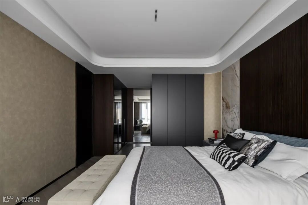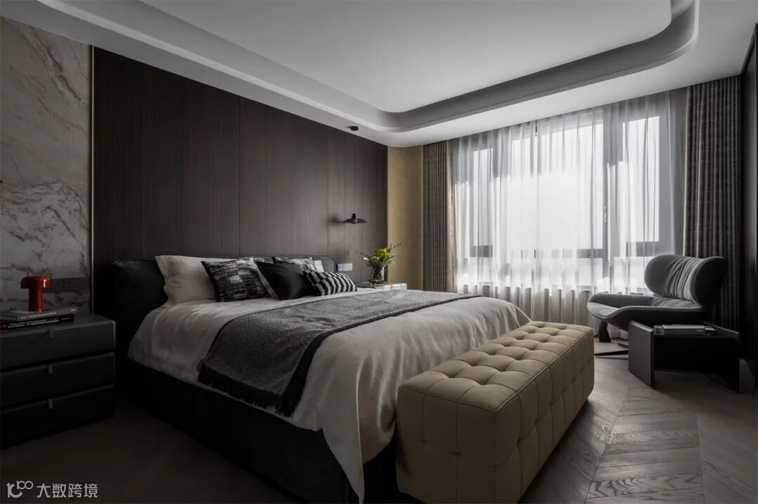 进入卧室,明亮的自然光线透过柔软的纱窗,洒满全屋,让气氛带着些许惬意,饱满的灰色调传递出沉静优雅的同时,也维持了空间的高级感。